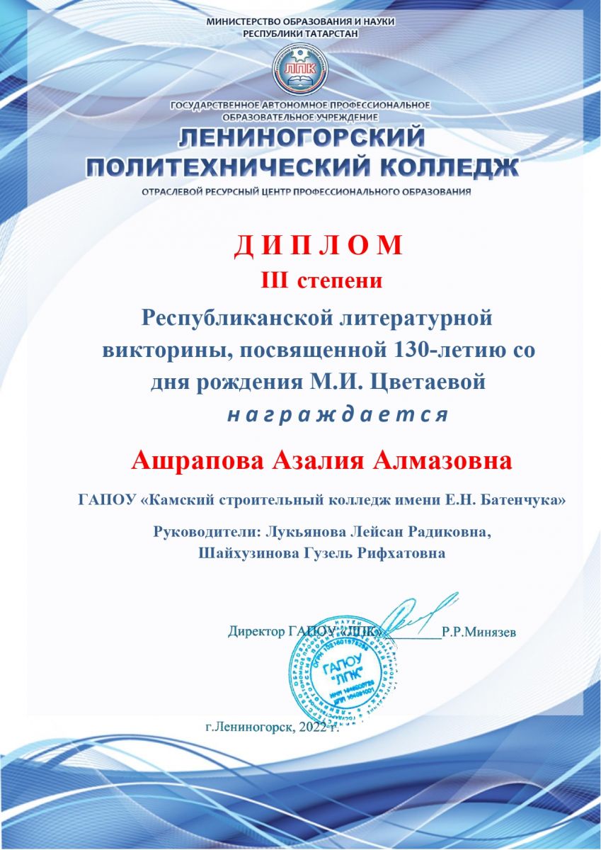 Ашрапова Азалия Алмазовна – диплом III степени, руководители Лукьянова Л.Р., Шайхузинова Г.Р.