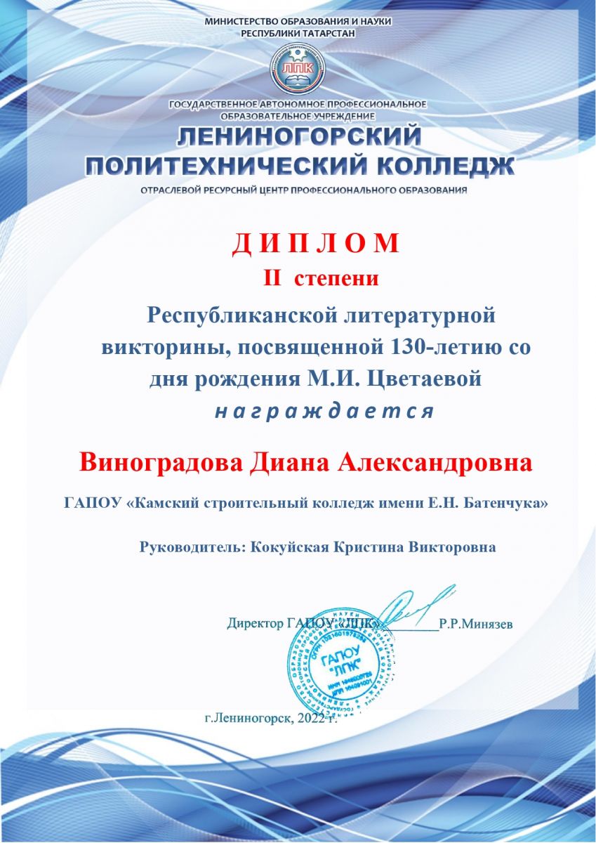 Виноградова Диана Александровна – диплом II степени, руководитель Кокуйская К.В.;