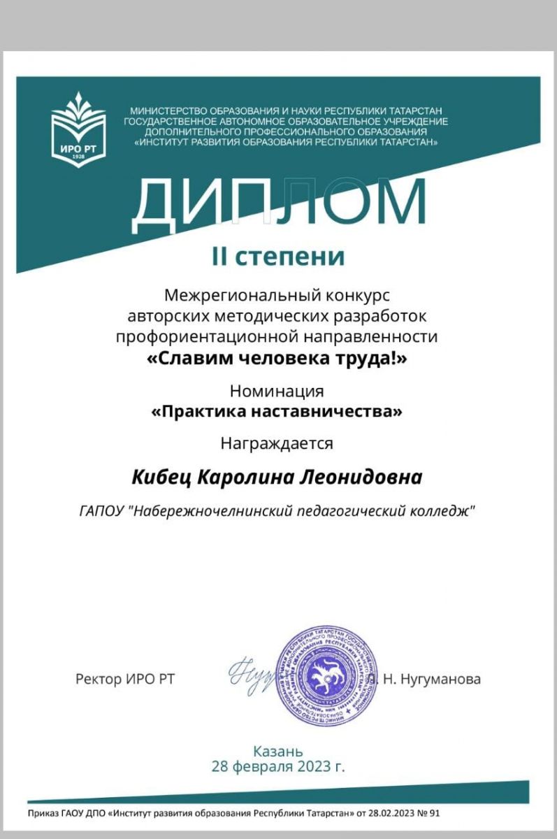 Благодарность Раиса Республики Татарстан была вручена и преподавателю нашего колледжа Хаматшиной Миляуше Рафисовне.