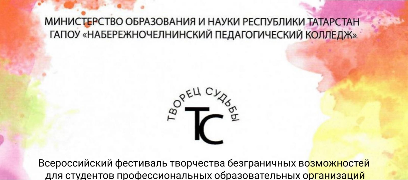 В соответствии с Календарным планом мероприятий Министерства образования и науки Республики Татарстан на 2022/2023 учебный год, с 28 октября по 14 ноября на базе ГАПОУ «Набережночелнинский педагогический колледж» прошел Всероссийский фестиваль творчества безграничных возможностей для студентов профессиональных образовательных организаций «Творец судьбы».