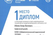 III отраслевой чемпионат в сфере информационных технологий по стандартам WorldSkills DigitalSkills-2021 завершился победой нашего студента 4 курса - Абеева Амира! Амир завоевал золотую медаль в компетенции Графический дизайн!! Поздравляем с высокими достижениями Абеева Амира и тренеров Голубеву Яну Станиславовну и Пискунову Светлану Юрьевну! Мы гордимся вами! Так держать!