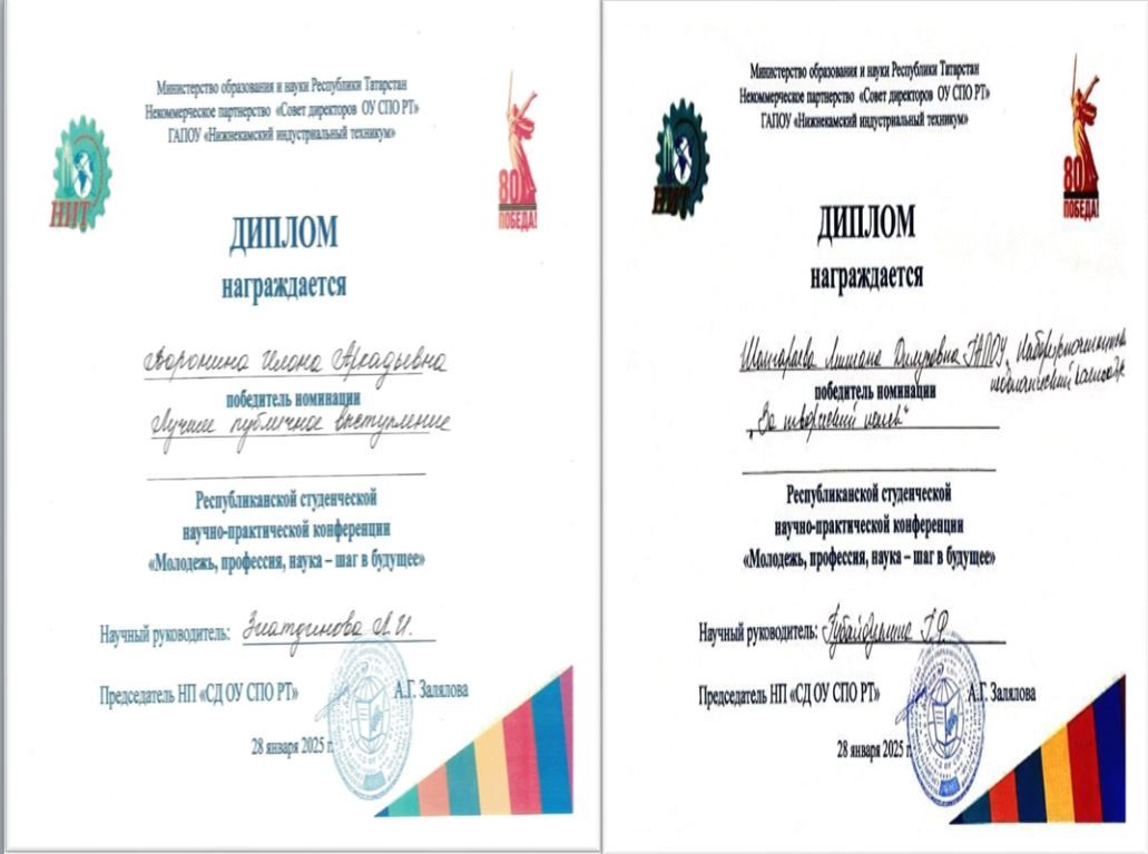 28 января 2025 года согласно плану Совета директоров ОУ СПО РТ на 2024-2025 учебный год на базе Нижнекамского индустриального техникума прошла научно-практическая конференция «Молодежь, профессия, наука – шаг в будущее». Студенты Набережночелнинского педагогического колледжа приняли участие в работе данной конференции и были удостоены дипломов: