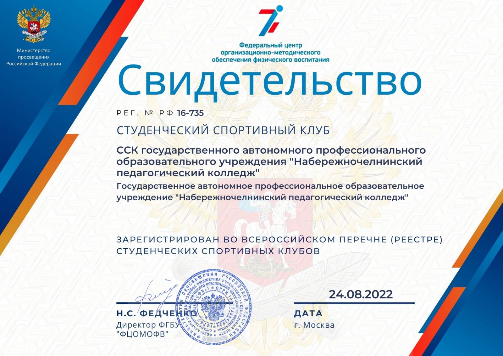 Свидетельство о регистрации во Всероссийском перечне (реестре) студенческих спортивных клубов