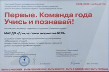 Поздравляем первичное отделение Движения Первых Дома детского творчества № 15 с победой в номинации "Команда года" Движения Первых за особые успехи в реализации тематического направления "Образование и знания"! Это достижение — результат вашего упорного труда, командного духа и стремления к совершенству. Вы доказали, что вместе можно достичь многого, и ваш пример вдохновляет других на активные действия и участие в жизни движения.