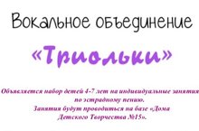 Вокальное объединение "Триольки" объявляет набор детей 4-7 лет на индивидуальные занятия по эстрадному пению. В программу обучения входит: постановка голоса, дыхания; обучение различным видам вокальной техники; развитие музыкального слуха; работа над дикцией, чувством ритма. Занятия ведет педагог дополнительного образования: Пикмеева Виктория Эдуардовна, тел: +7 (958) 625-27-15