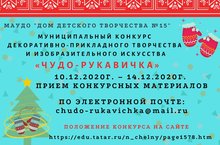 Муниципальный конкурс декоративно-прикладного творчества и изобразительного искусства "Чудо-рукавичка" проводится с целью поддержки и развития одаренных детей в области художественного творчества. Конкурс проводится с 10 по 25 декабря 2020 года. Подробности в Положении конкурса.