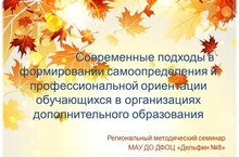 Состоялся региональный методический семинар "Современные подходы в формировании самоопределения и профессиональной ориентации обучающихся в организациях дополнительного образования" в котором приняли участие методисты, педагоги-организаторы, педагоги дополнительного образования физкультурно-спортивной направленности.