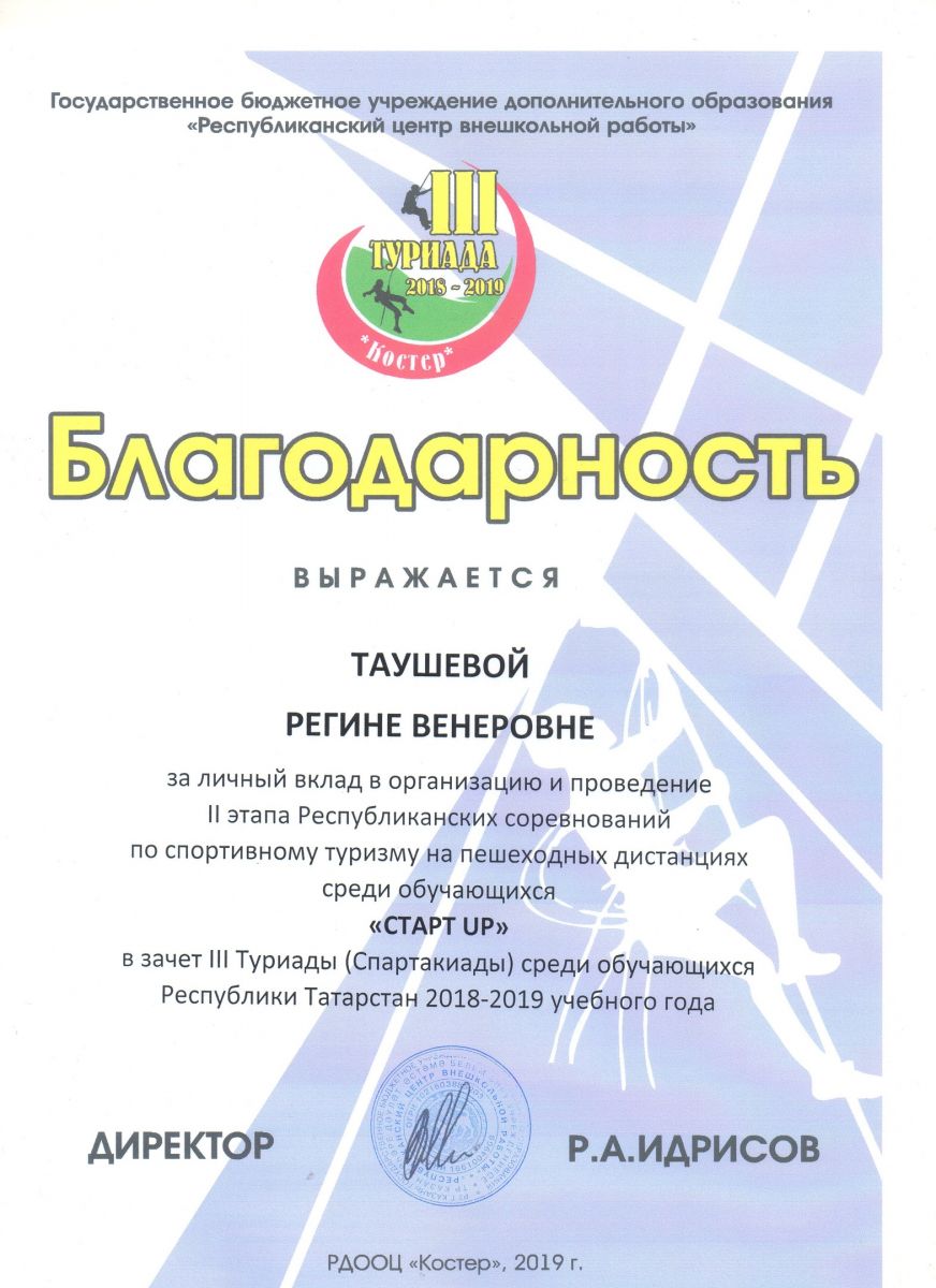 Почетная грамота ФЦДЮТ и К на 100 - летие туризма - 2018