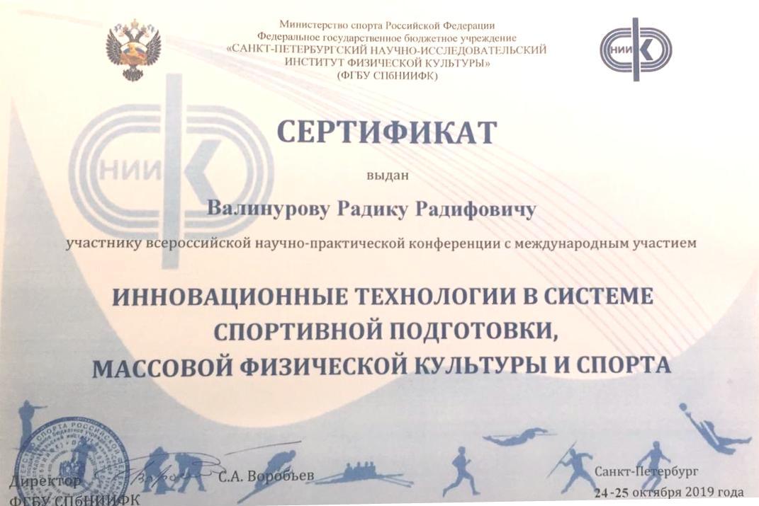 Валинуров Р.Р. Всероссийская научно-практическая конференция с международным участием "Инновационные технологии в системе спортивной подготовки, массовой физической культуры спорта" (24-25.10.2019)