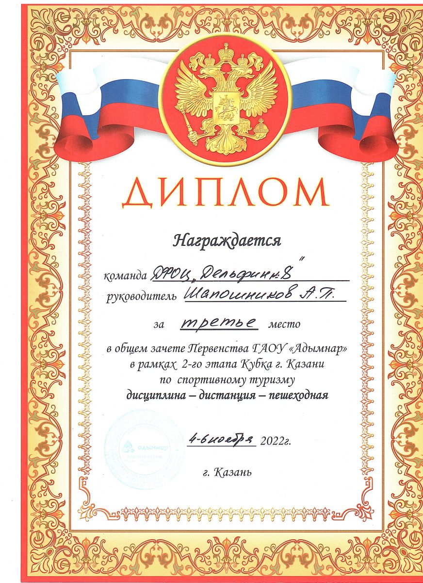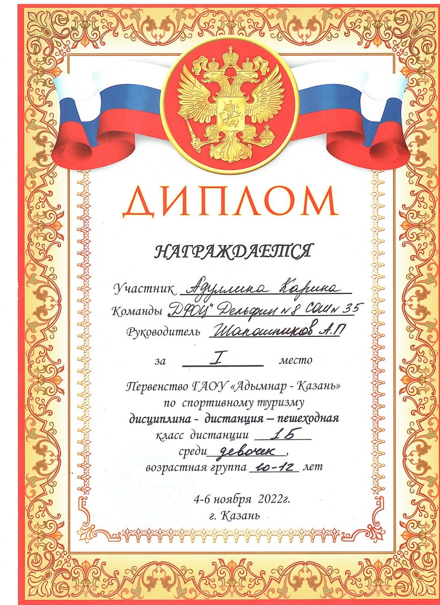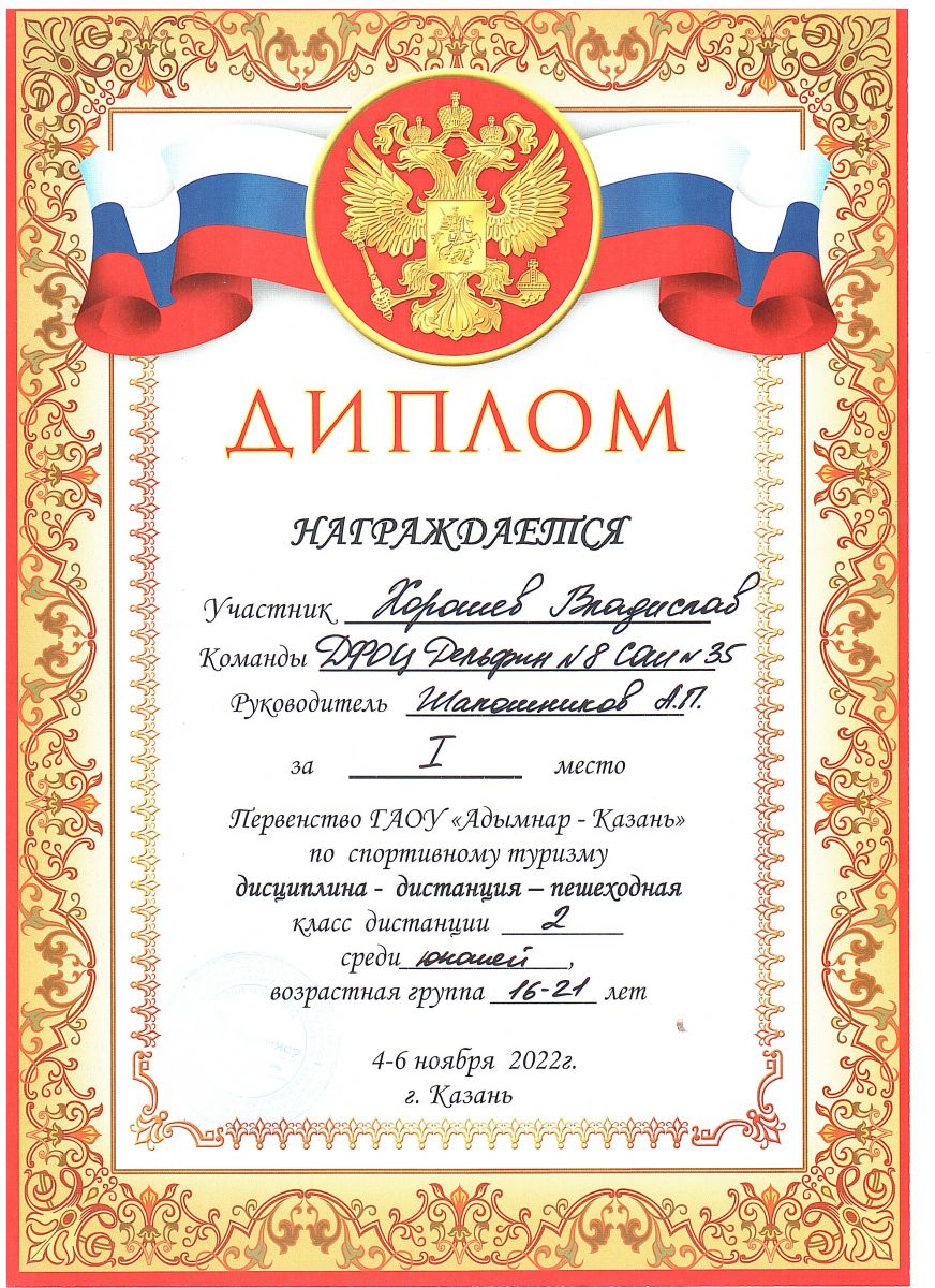 Адуллина Карина 1 место, Медведева Анжелика 1 место, Садыков Амир 1 место, Солодов Данил 1 место, Хорошев Владислав 1 место, Тухвеева Диана 2 место, Фурсова Карина 3 место, Команда ДФОЦ 3 место в Первенстве ГАОУ "Адымнар-Казань" по спортивному туризму (04-06.11.2022)