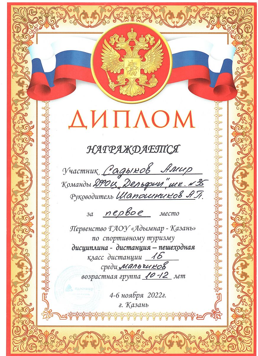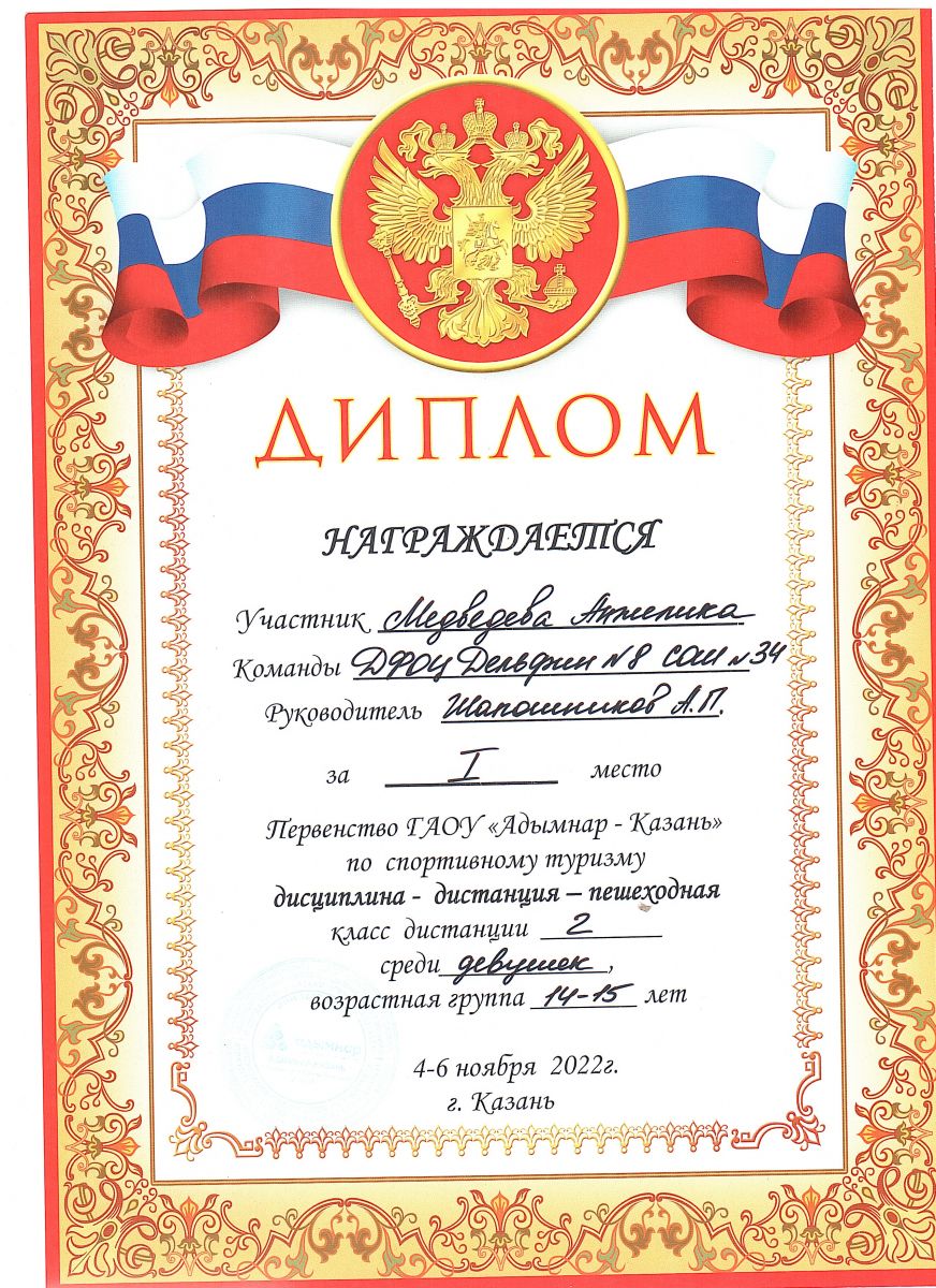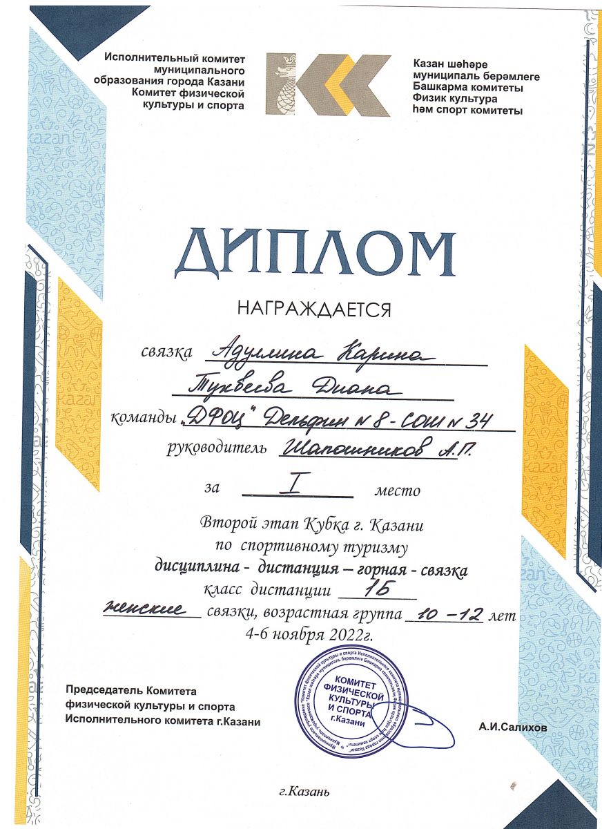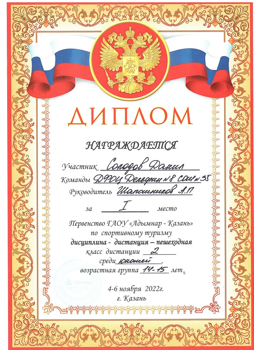 Адуллина Карина 1 место, Медведева Анжелика 1 место, Садыков Амир 1 место, Солодов Данил 1 место, Хорошев Владислав 1 место, Тухвеева Диана 2 место, Фурсова Карина 3 место, Команда ДФОЦ 3 место в Первенстве ГАОУ "Адымнар-Казань" по спортивному туризму (04-06.11.2022)