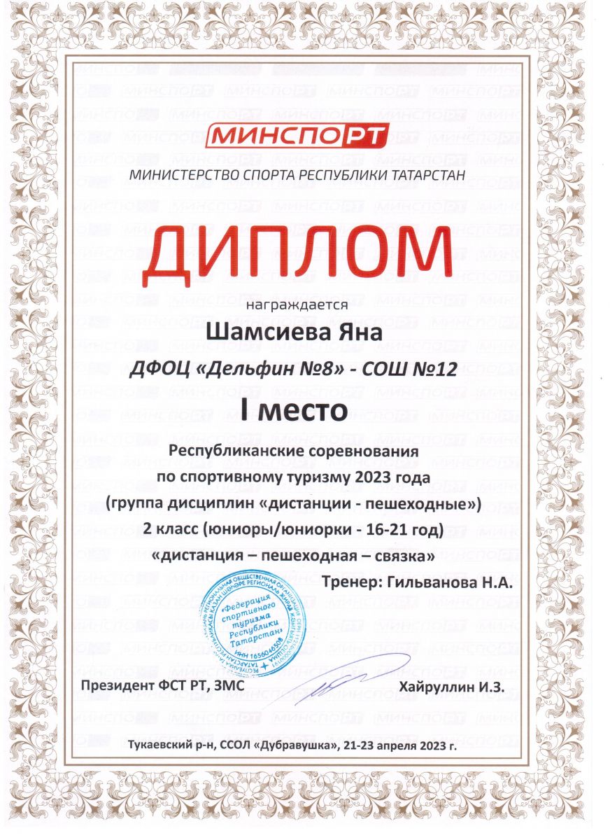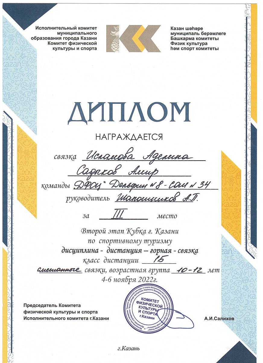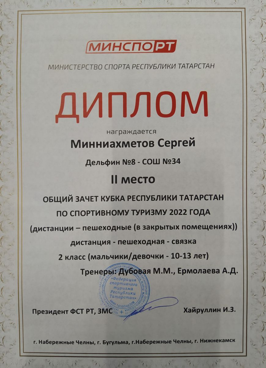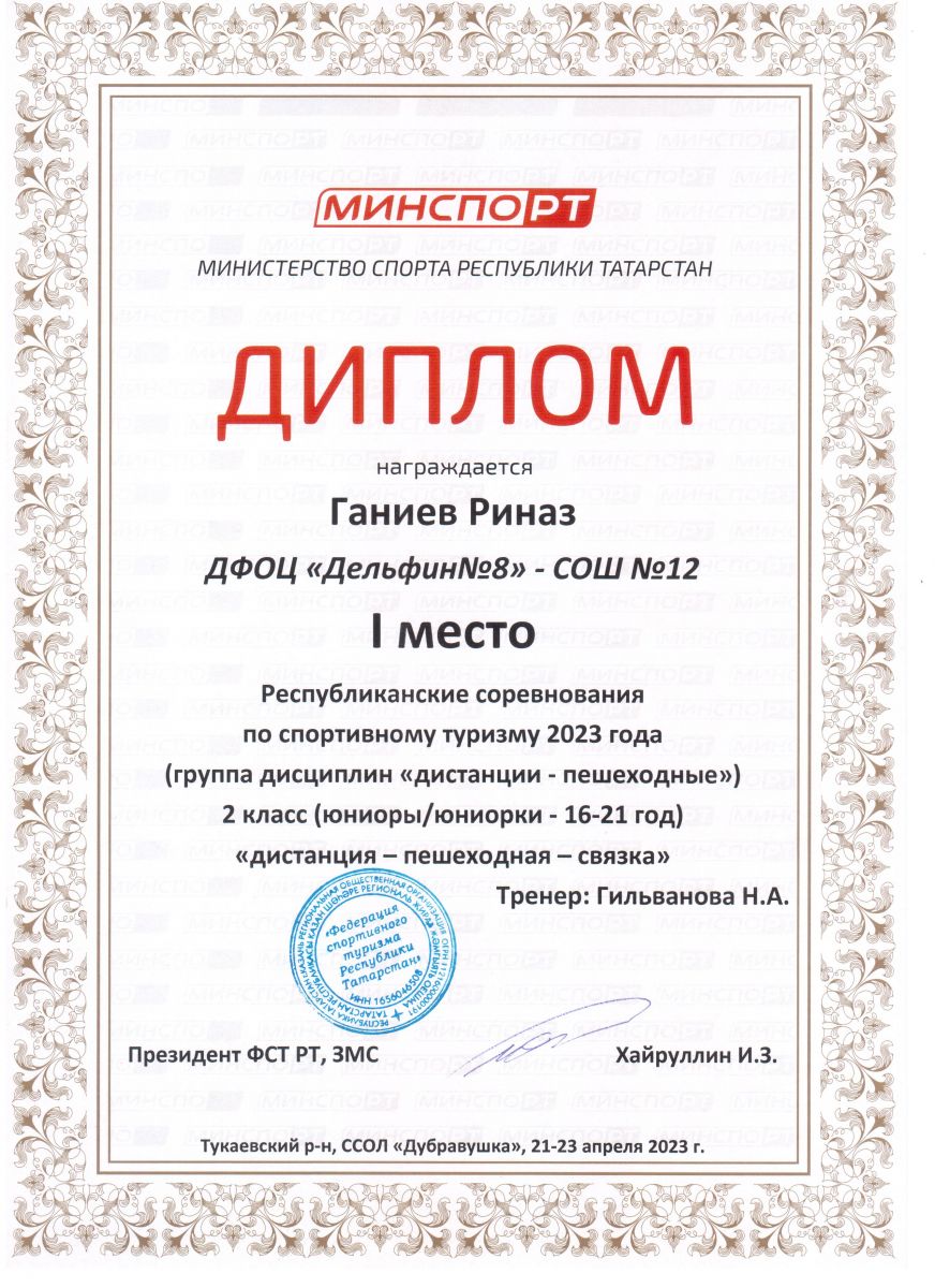 Вдовина Анастасия 1 место, Ганиев Риназ 1 место, Моисеенко София 1 место, Саляхов Динарт 1 место, Шамсиева Яна 1 место, Голяков Артур 1 место, Демидов Богдан 1 место, Валиахметов Амир 2 место, Голяков Артур 2 место, Иванов Адель 2 место, Мавлютова Маргарита 2 место, Вдовина Анастасия 2 место, Моисеенко София 2 место, Мокрополова Елизавета 2 место, Шамсиева Яна 2 место, Шамсиева Яна 2 место, Казарин Андрей 2 место, Тазова Виктория 2 место, Фархутдинов Булат 2 место, Агафонова Евгения 3 место, Пиминов Савелий 3 место, Тазова Вероника 3 место, Гарипов Александр 3 место, Демидов Богдан 3 место, Муратов Карим 3 место, Сальманов Булат 3 место во 2 этапе Кубка РТ по спортивному туризму (31-02.04.2023)