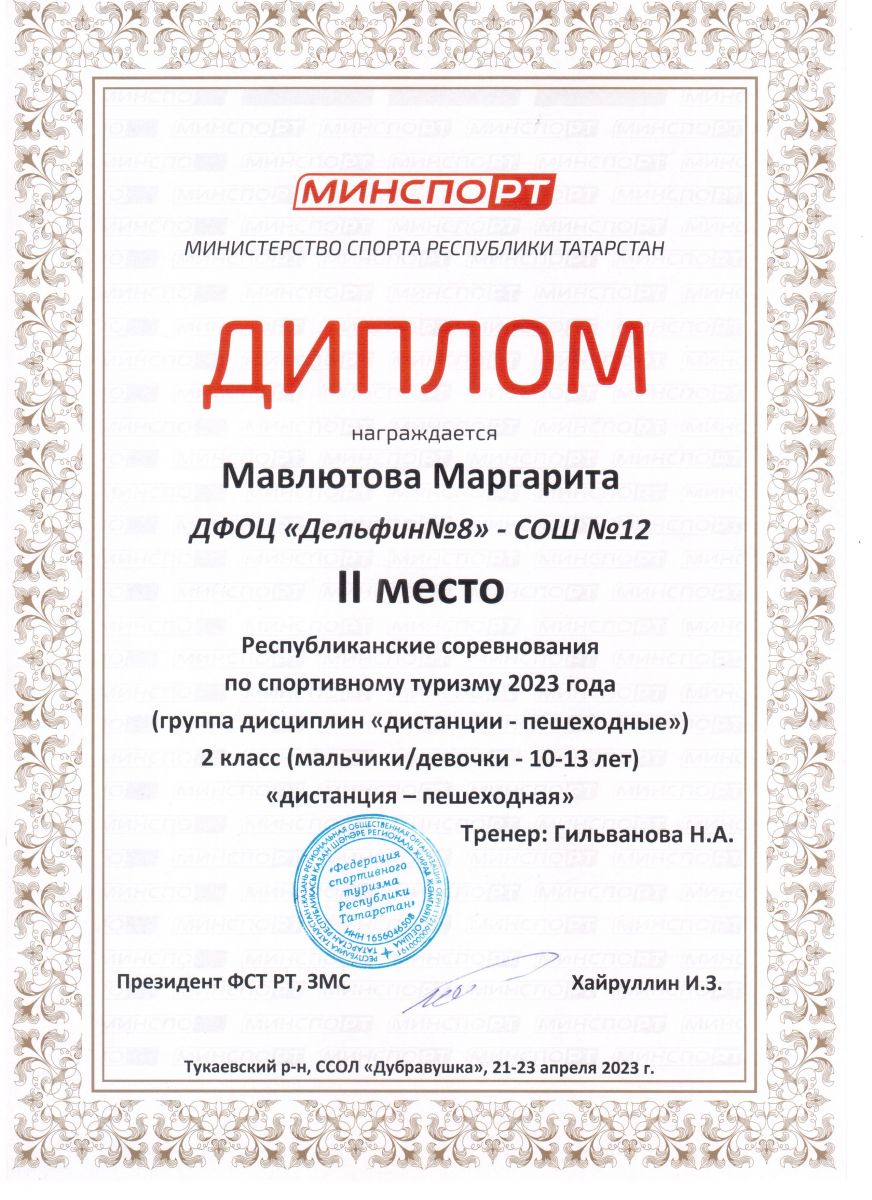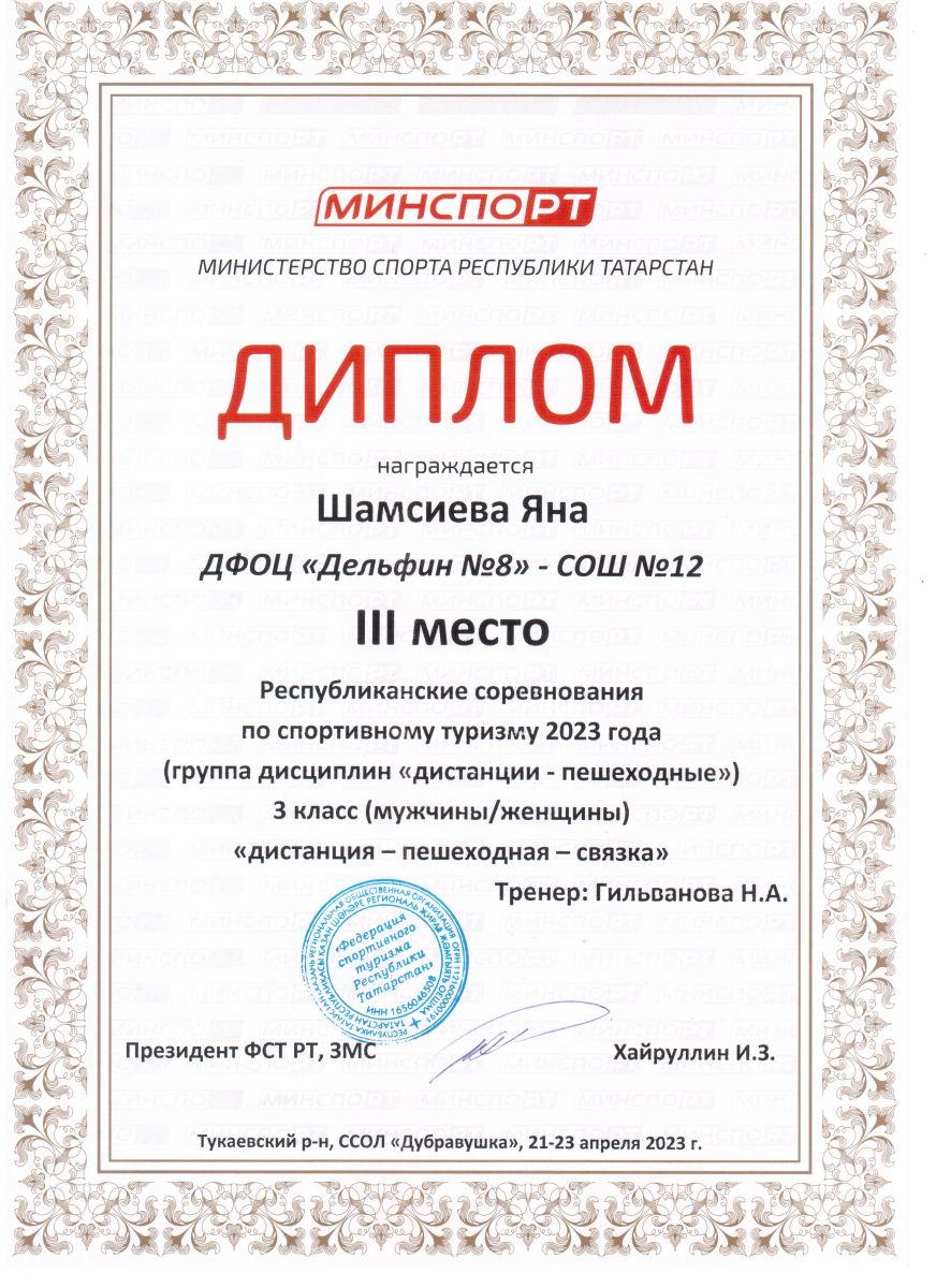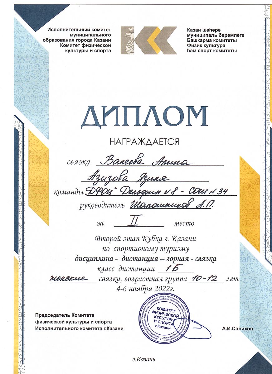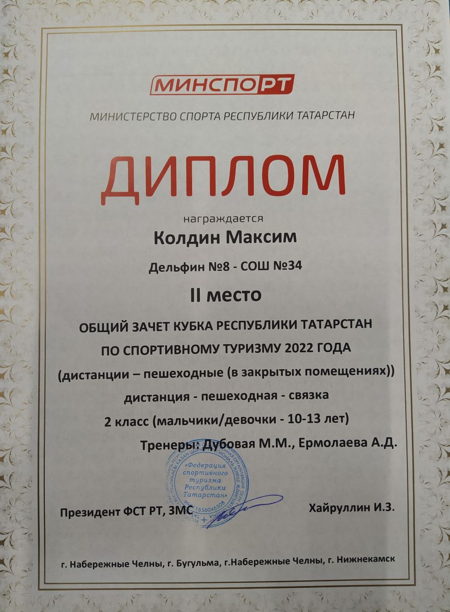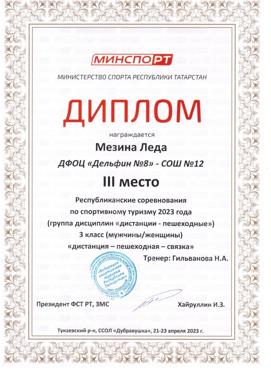 Вдовина Анастасия 1 место, Ганиев Риназ 1 место, Моисеенко София 1 место, Саляхов Динарт 1 место, Шамсиева Яна 1 место, Голяков Артур 1 место, Демидов Богдан 1 место, Валиахметов Амир 2 место, Голяков Артур 2 место, Иванов Адель 2 место, Мавлютова Маргарита 2 место, Вдовина Анастасия 2 место, Моисеенко София 2 место, Мокрополова Елизавета 2 место, Шамсиева Яна 2 место, Шамсиева Яна 2 место, Казарин Андрей 2 место, Тазова Виктория 2 место, Фархутдинов Булат 2 место, Агафонова Евгения 3 место, Пиминов Савелий 3 место, Тазова Вероника 3 место, Гарипов Александр 3 место, Демидов Богдан 3 место, Муратов Карим 3 место, Сальманов Булат 3 место во 2 этапе Кубка РТ по спортивному туризму (31-02.04.2023)