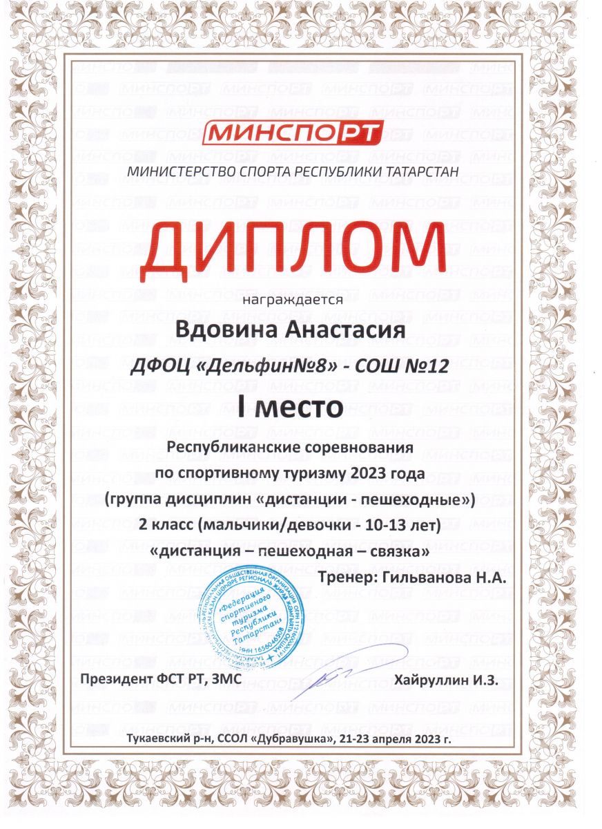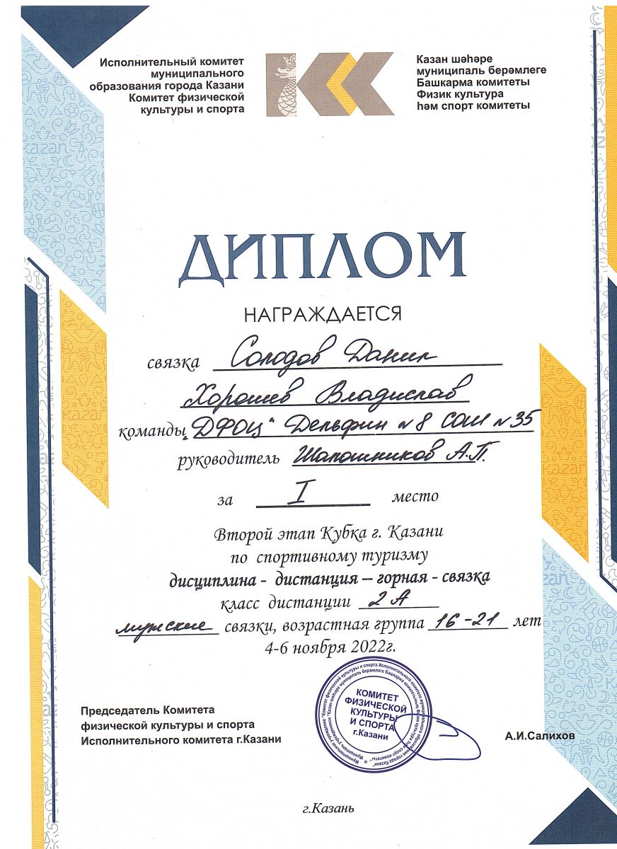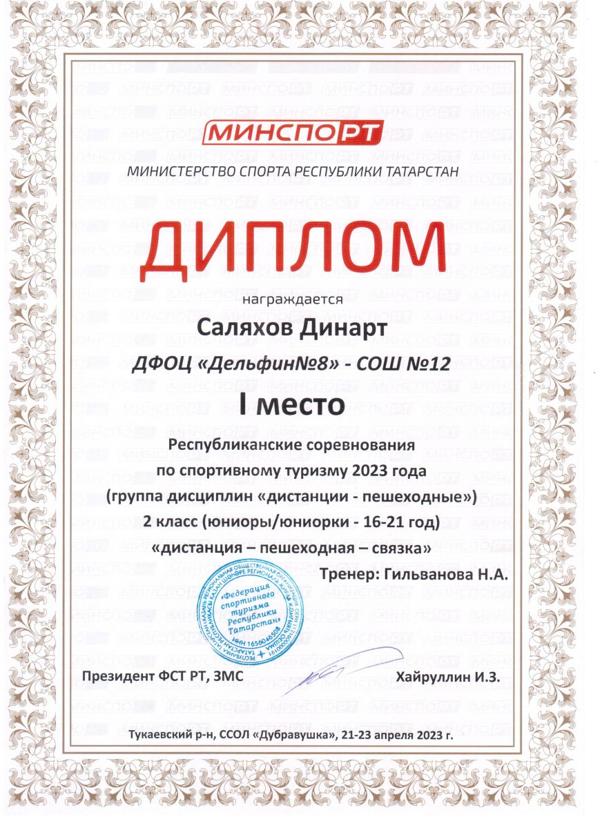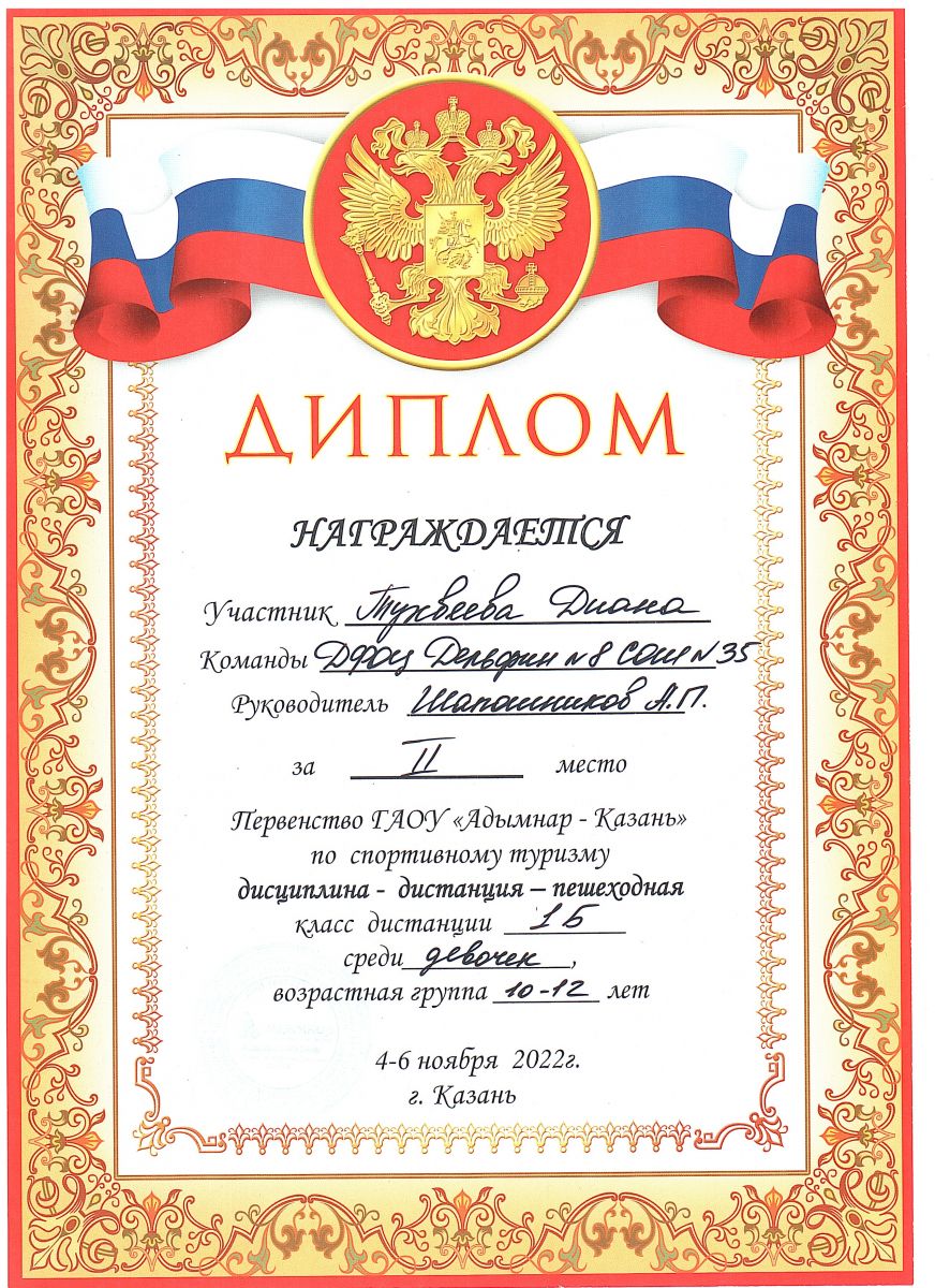 Вдовина Анастасия 1 место, Ганиев Риназ 1 место, Моисеенко София 1 место, Саляхов Динарт 1 место, Шамсиева Яна 1 место, Голяков Артур 1 место, Демидов Богдан 1 место, Валиахметов Амир 2 место, Голяков Артур 2 место, Иванов Адель 2 место, Мавлютова Маргарита 2 место, Вдовина Анастасия 2 место, Моисеенко София 2 место, Мокрополова Елизавета 2 место, Шамсиева Яна 2 место, Шамсиева Яна 2 место, Казарин Андрей 2 место, Тазова Виктория 2 место, Фархутдинов Булат 2 место, Агафонова Евгения 3 место, Пиминов Савелий 3 место, Тазова Вероника 3 место, Гарипов Александр 3 место, Демидов Богдан 3 место, Муратов Карим 3 место, Сальманов Булат 3 место во 2 этапе Кубка РТ по спортивному туризму (31-02.04.2023)