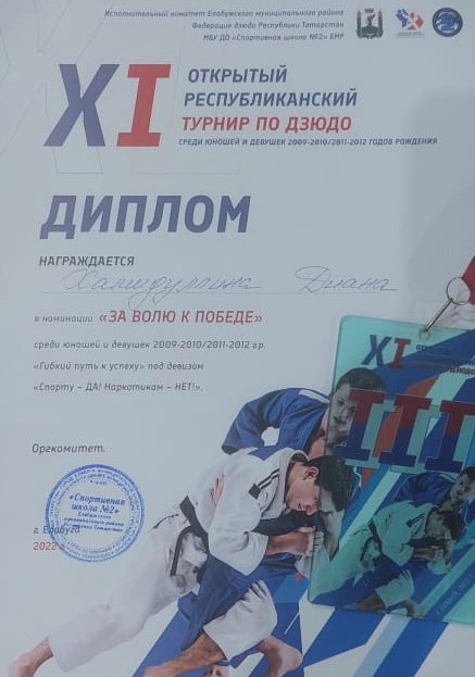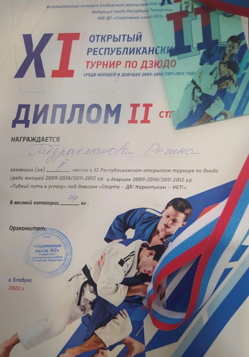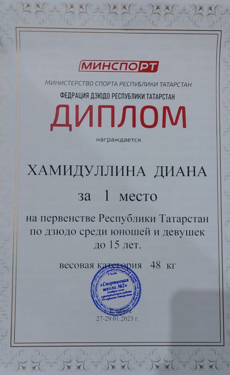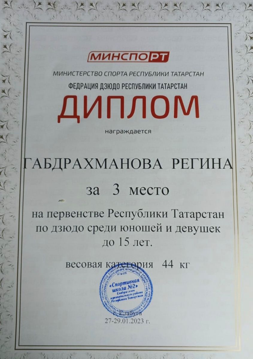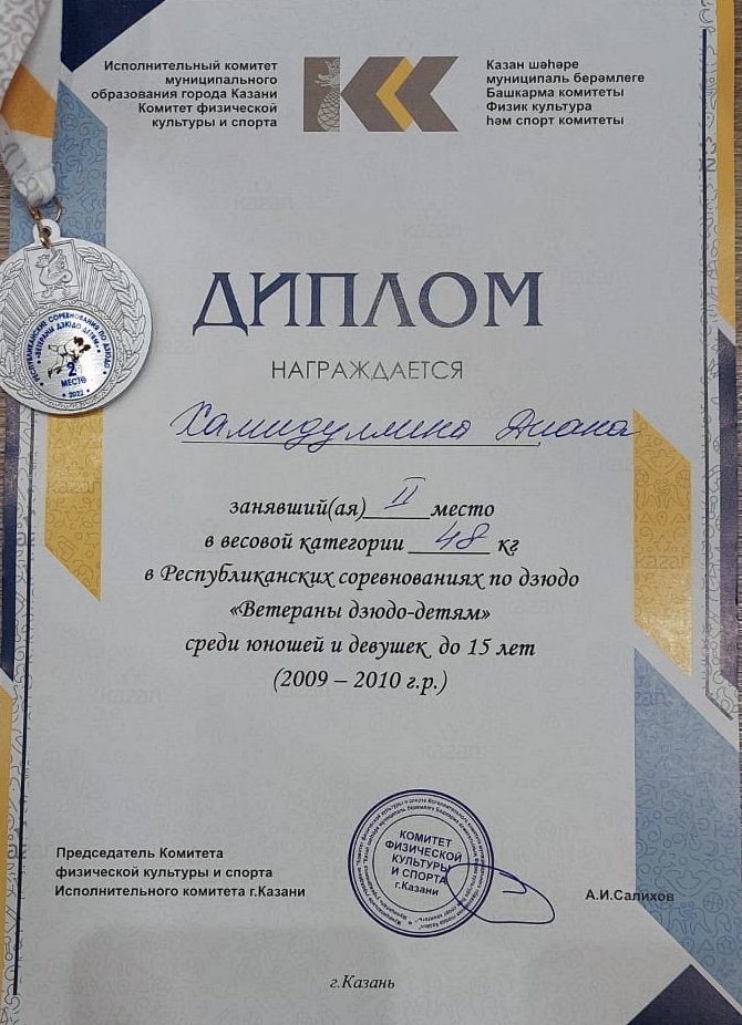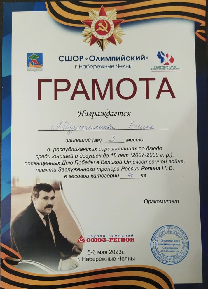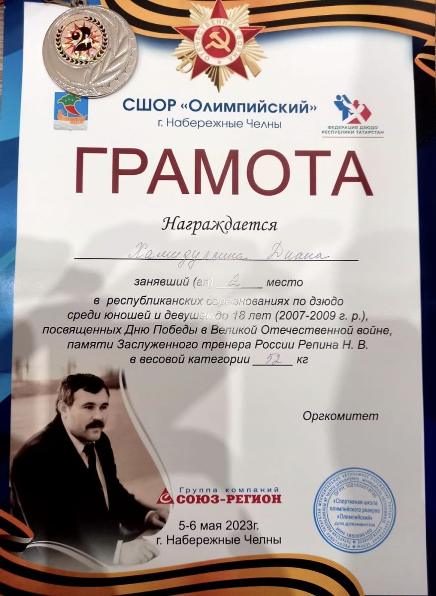 Хамидуллина Диана 2 место, Габдрахманова Регина 3 место в Республиканских соревнованиях по дзюдо среди юношей и девушек, посвященных Дню Победы в Великой Отечественной войне, заслуженного тренера России Репина Н.В. (05-06.2023)