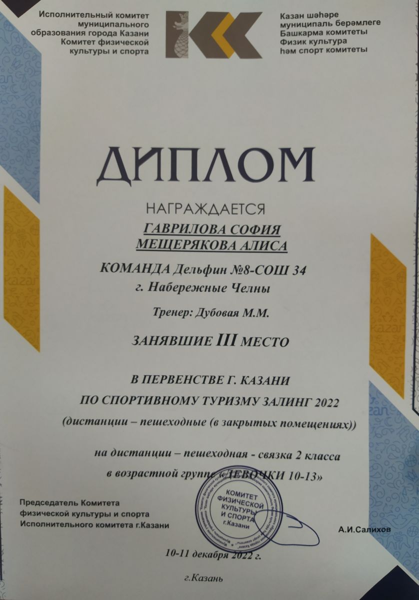 Гаврилова Софья-Мещерякова Алиса 3 место в Первенстве города Казань по спортивному туризму ЗАЛИНГ-2022 (10-11.12.2022)