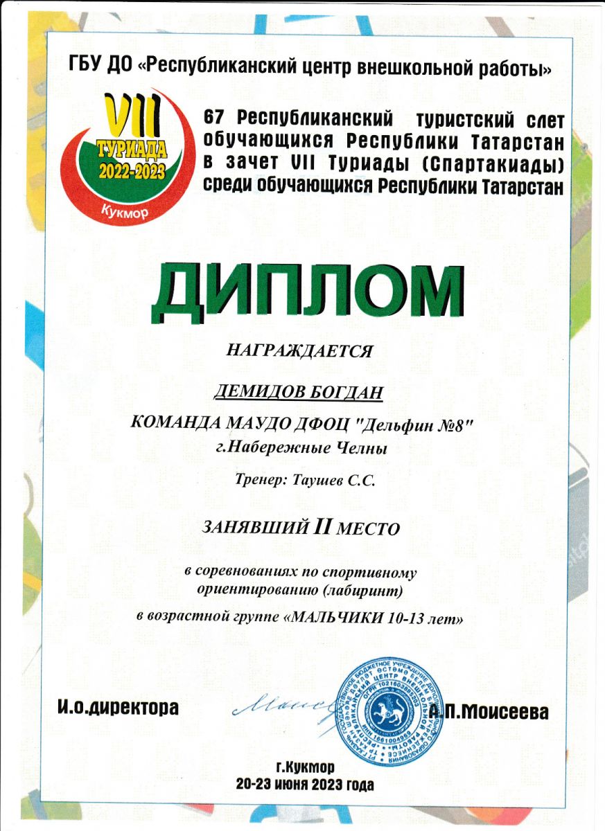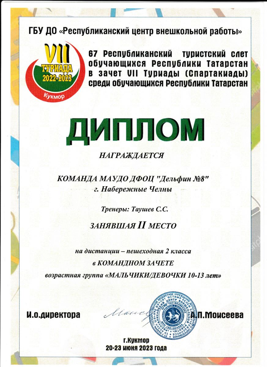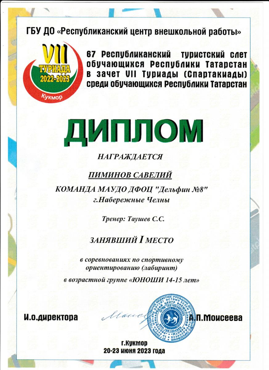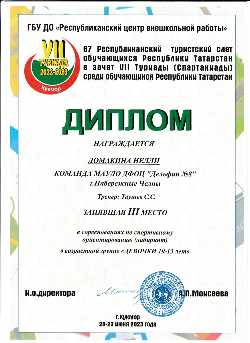 Пиминов Савелий 1 место ориентирование, Нифонтова Варвара 1 место дистанция пешеходная, Демидов Богдан 2 место ориентирование, Ломакина Нелли 2 место конкурс капитанов, Ломакина Нелли 3 место ориентирование, Команда 1 место конкурсная программа, Команда 2 место дистанция пешеходная, Команда 2 место конкурс стенгазет, Команда 3 место ориентирование, Команда 3 место общий зачет в 67 Республиканском туристском слете обучающихся Республики Татарстан в зачет VII Туриады (Спартакиады) среди обучающихся Республики Татарстан (20-23.06.2023)