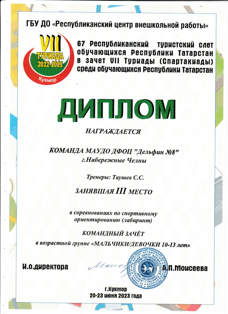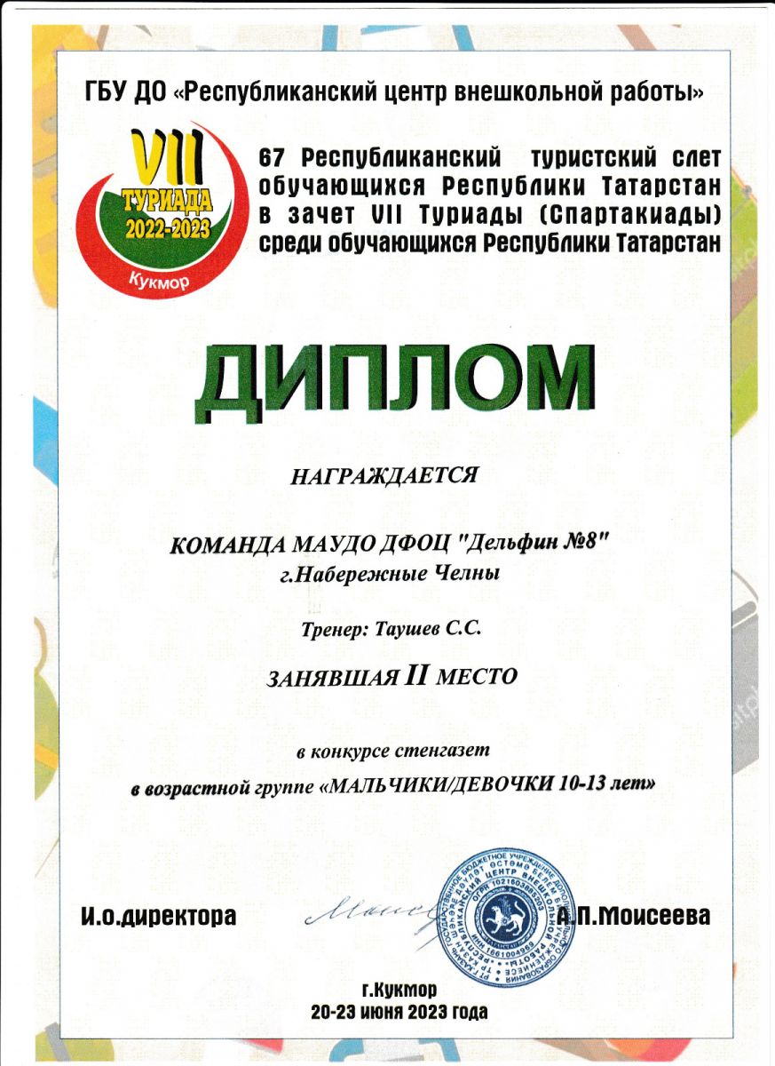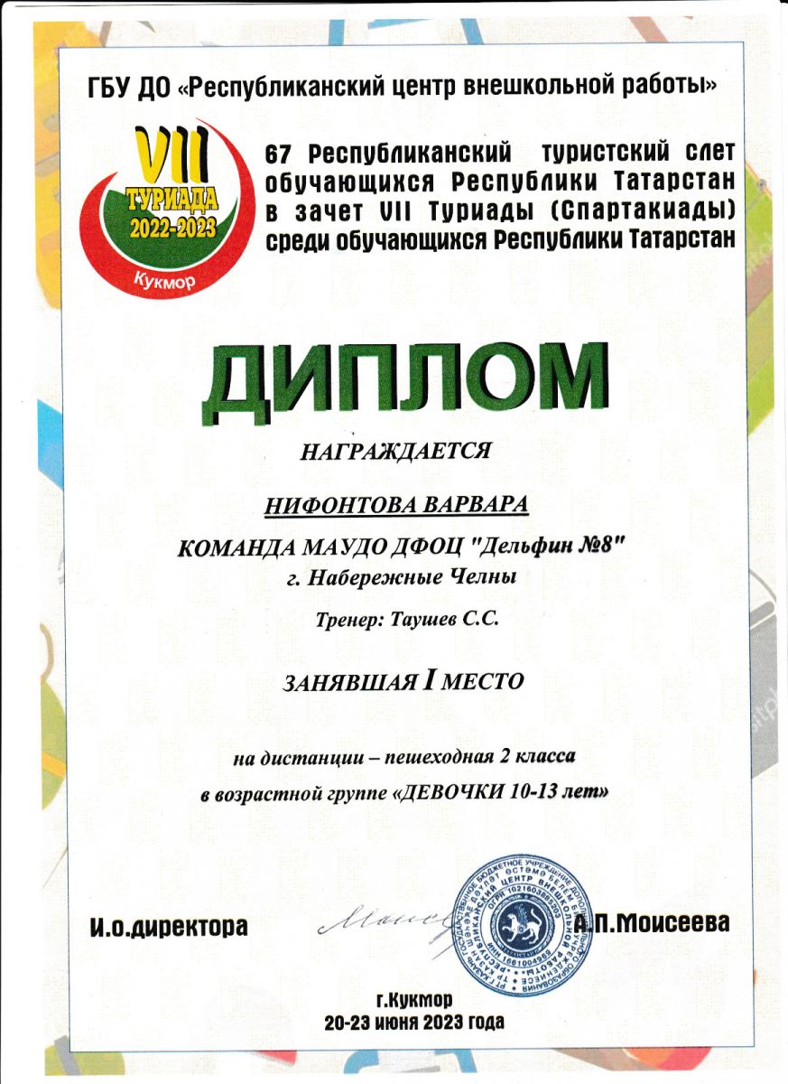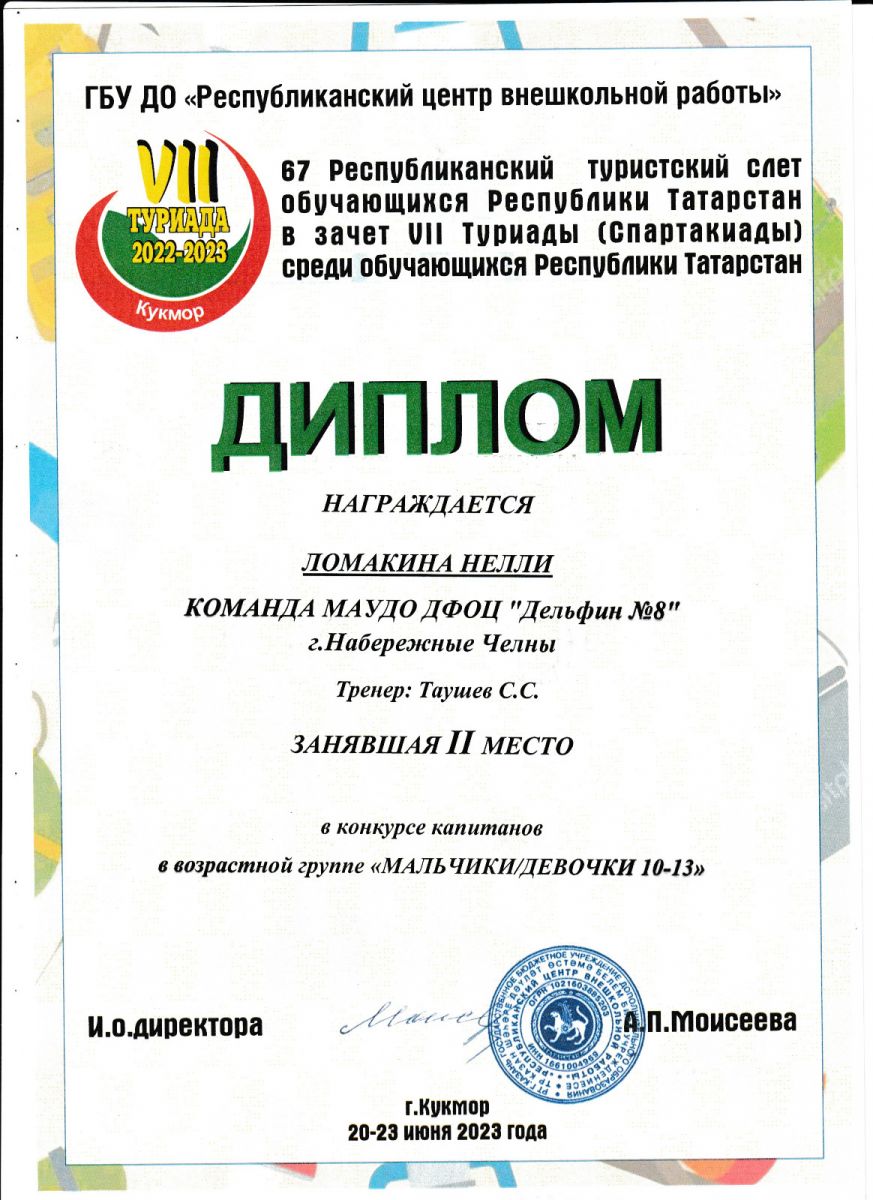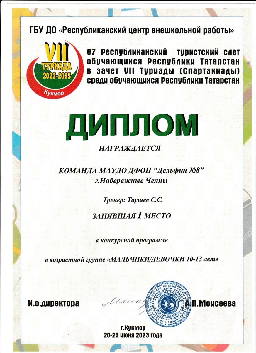 Пиминов Савелий 1 место ориентирование, Нифонтова Варвара 1 место дистанция пешеходная, Демидов Богдан 2 место ориентирование, Ломакина Нелли 2 место конкурс капитанов, Ломакина Нелли 3 место ориентирование, Команда 1 место конкурсная программа, Команда 2 место дистанция пешеходная, Команда 2 место конкурс стенгазет, Команда 3 место ориентирование, Команда 3 место общий зачет в 67 Республиканском туристском слете обучающихся Республики Татарстан в зачет VII Туриады (Спартакиады) среди обучающихся Республики Татарстан (20-23.06.2023)