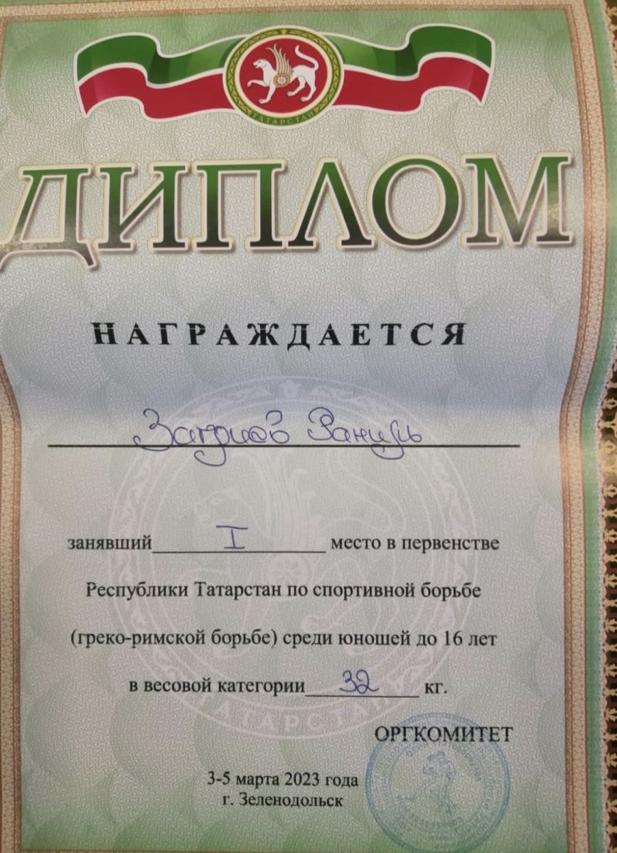 Загриев Раниль 1 место в Первенстве РТ по греко-римской борьбе среди юношей до 16 лет (03-05.03.2023)