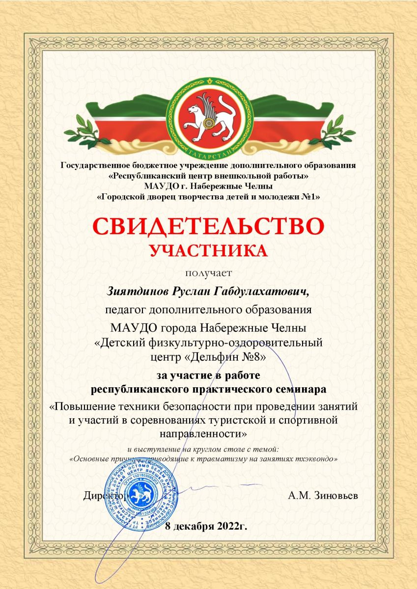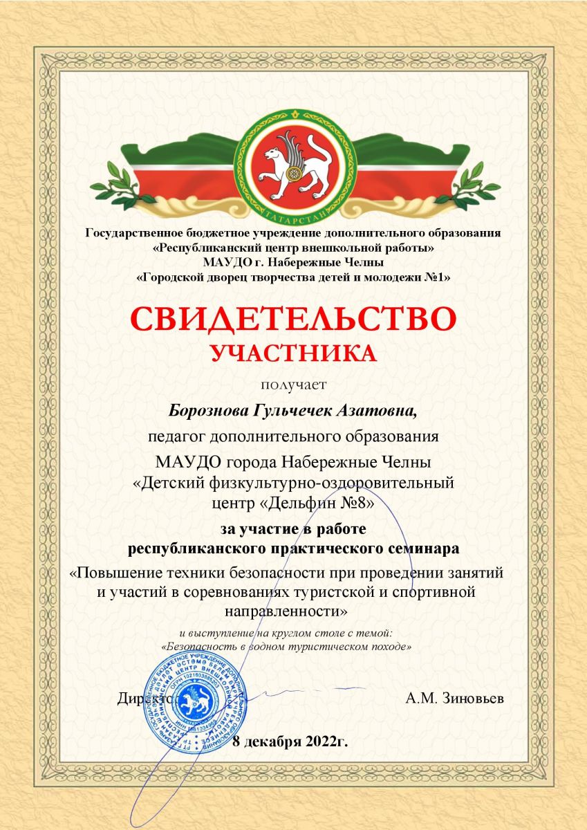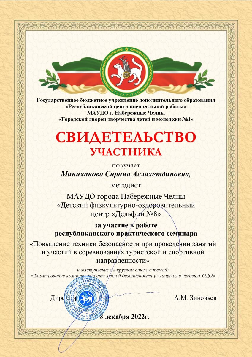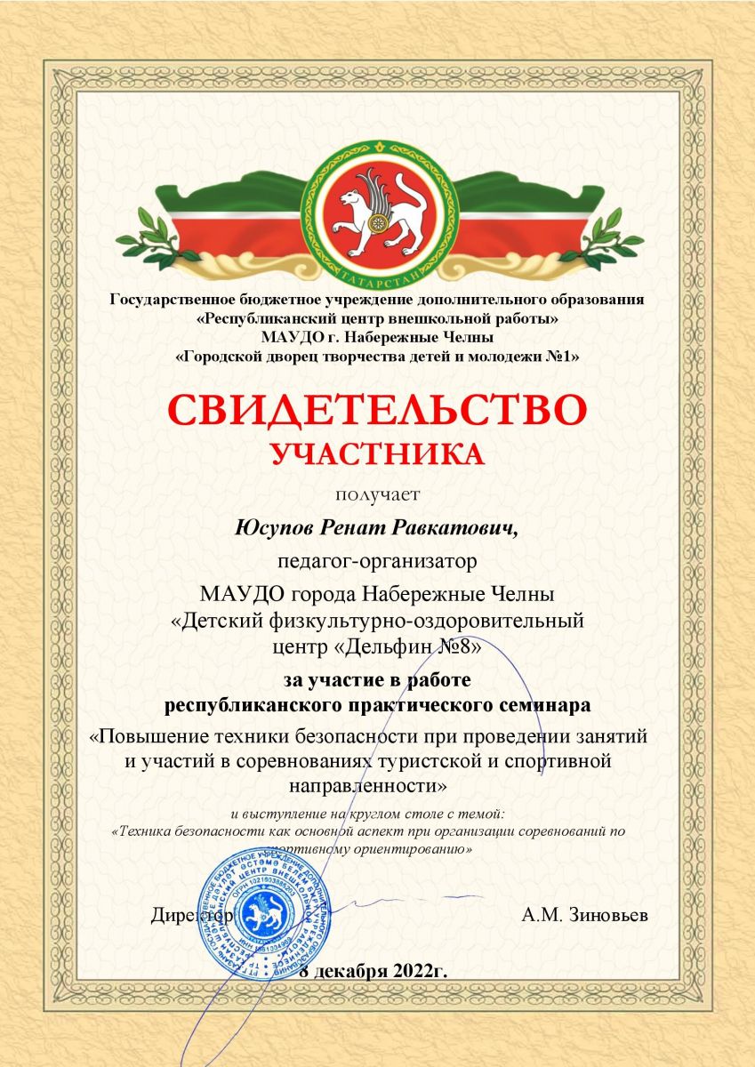 Арзамасцева Р.В., Борознова Г. А., Бурганова О. В. Валинуров Р. Р., Гильванова Н. А., Дубовая М. М., Зиаева Л. М., Зиятдинов Р. Г., Ильина Г. Ф., Миниханова С. А., Михейкина Н. Р., Таушев С_С., Старожилов С. В., Цыганов И. В., Шапошников А. П., Щипицын В. В., Юсупов Р. Р. - приняли участие в Республиканском практическом семинаре "Повышение техники безопасности при проведении занятий и участий в соревнованиях туристской и спортивной направленности" (08.12.2022 г.)