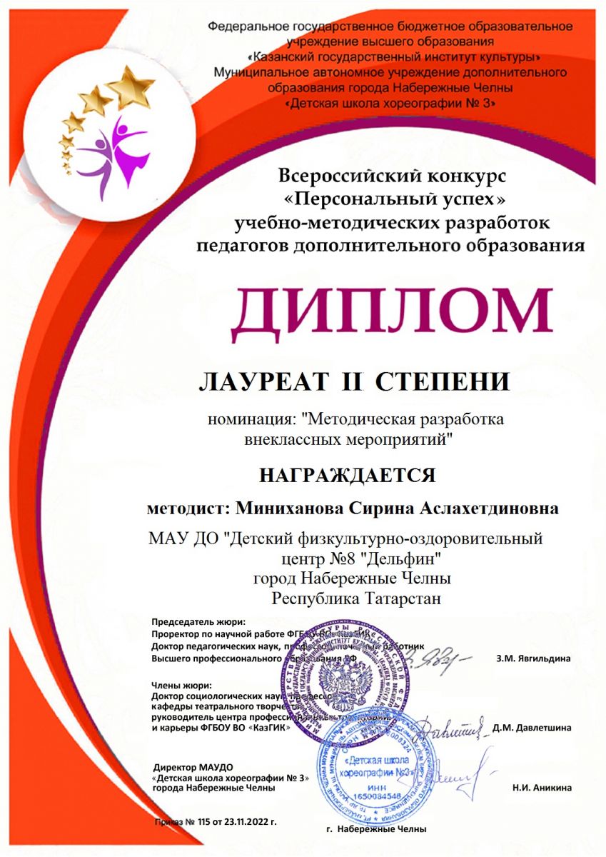 Минниханова С.А. - диплом лауреата 2 степени во Всероссийском конкурсе "Персональный успех" учебно-методических разработок педагогов дополнительного образования (23.11.2022 г.)