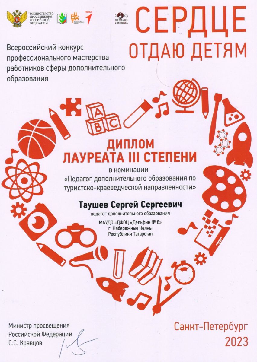 - Таушев С.С. лауреат III степени Всероссийского конкурса профессионального мастерства работников сферы дополнительного образования "Сердце отдаю детям" в номинации "Педагог дополнительного образования туристско-краеведческой направленности" (2023)