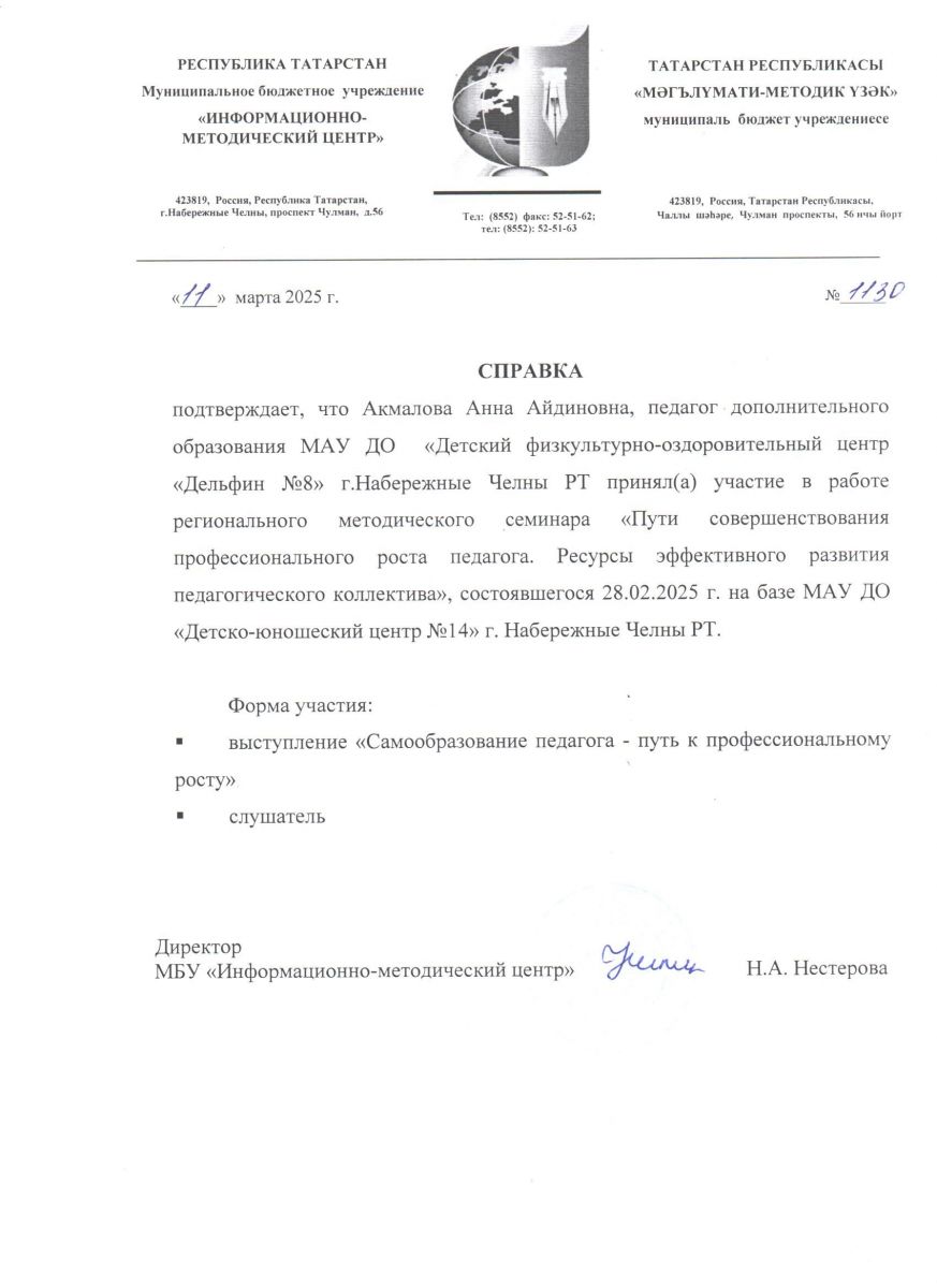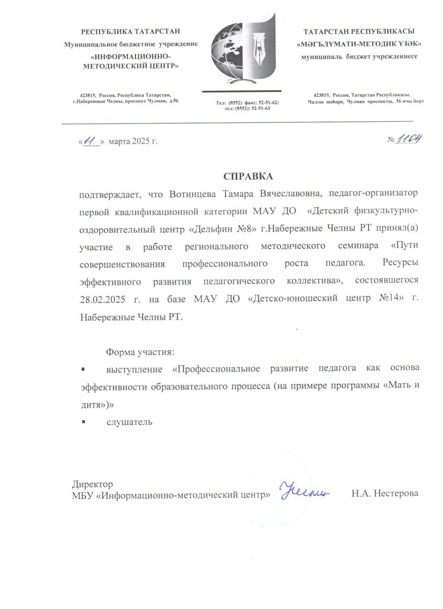 - Акмалова А.А., Ильина Г.Ф., Дубовая М.М., Вотинцева Т.В.- приняли участие в работе регионального семинара "Пути совершенствования профессионального роста педагога. Ресурсы эффективного развития педагогического коллектива." (28.02.2025)