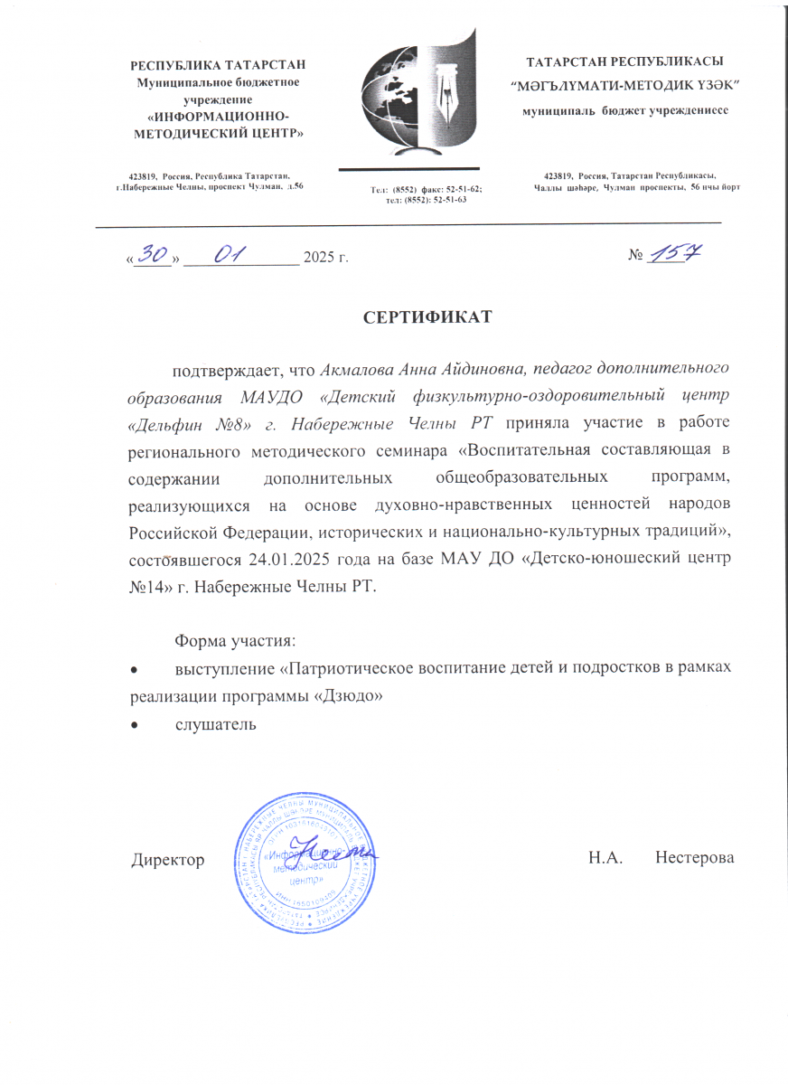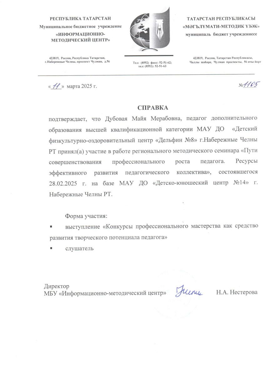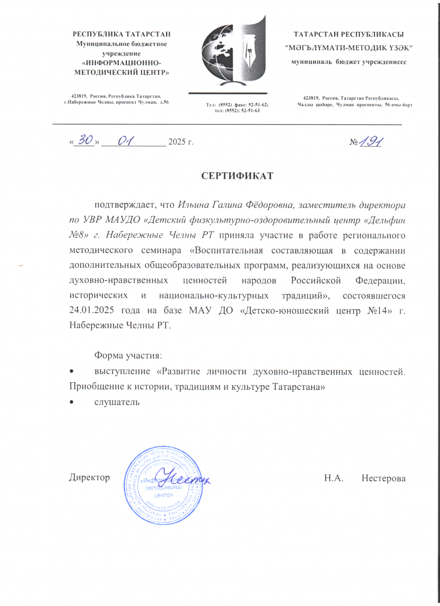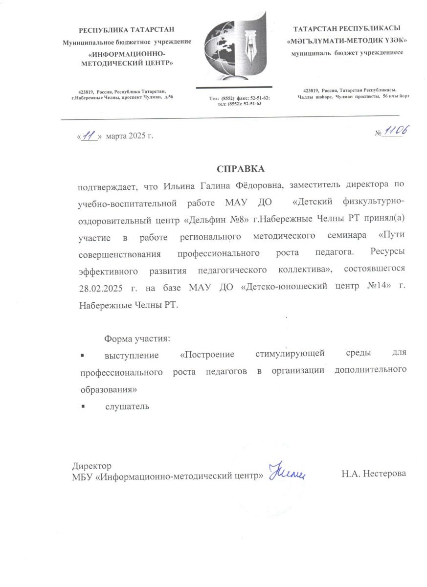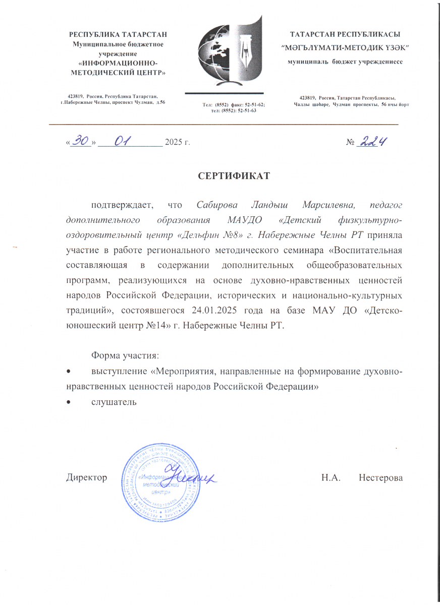 - Гильванова Н.А., Сабирова Л.М., Ильина ГФ. Акмалова А.А.- приняли участие в региональном методическом семинаре: "Воспитательная состовляющая в содержании дополнительных общеобразовательных программ, реализующихся на основе духовно-нравственных ценностей народов Российской Федерации, исторических и национально-культурных традиций" (24.01.2025)