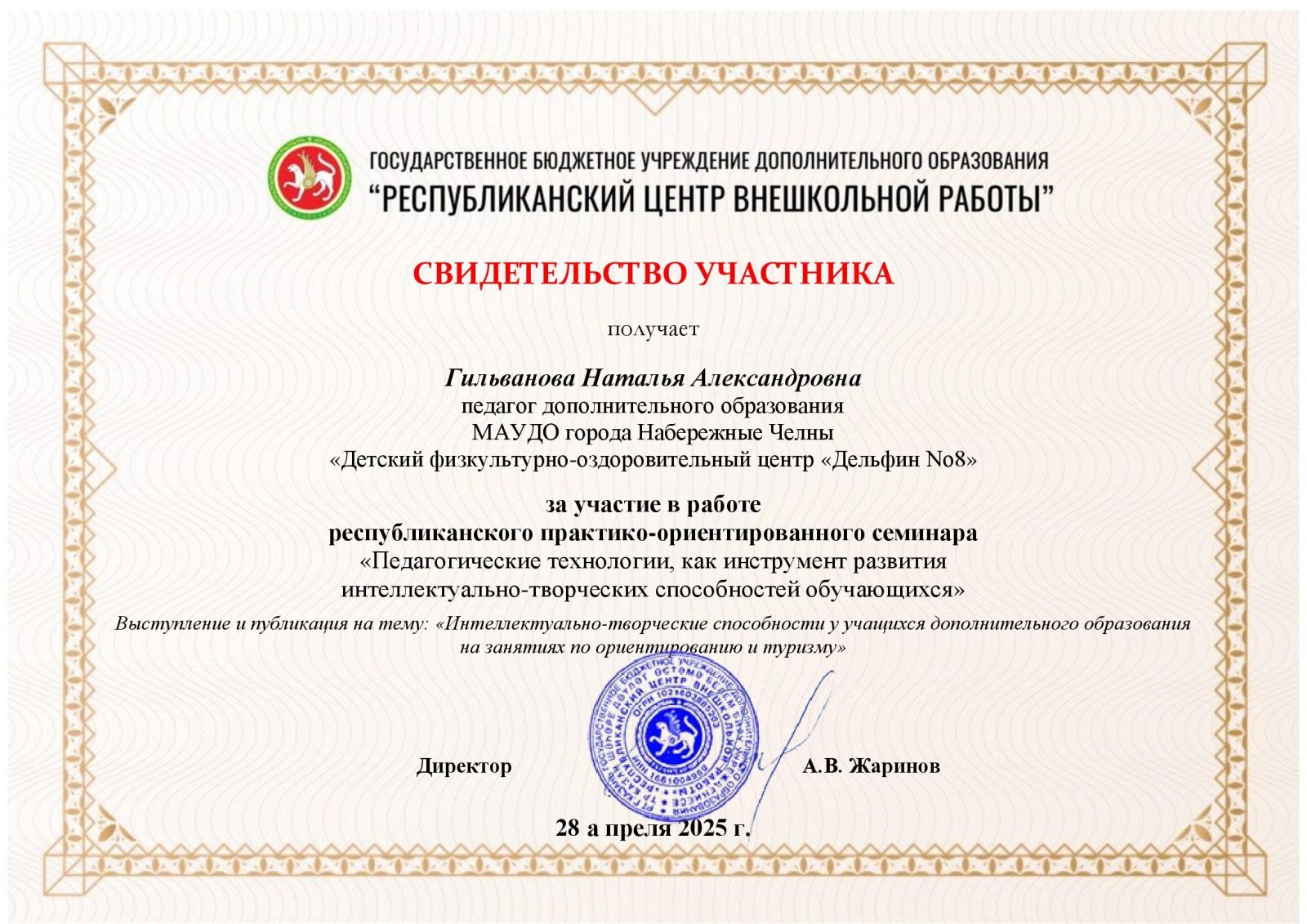 - Гильванова Н.А - приняла участие в работе республиканского практико-ориентировонного семинара "Педагогические технологии, как инструмент развития интеллектуально-творческих способностей обучающихся" (28.04.2025)