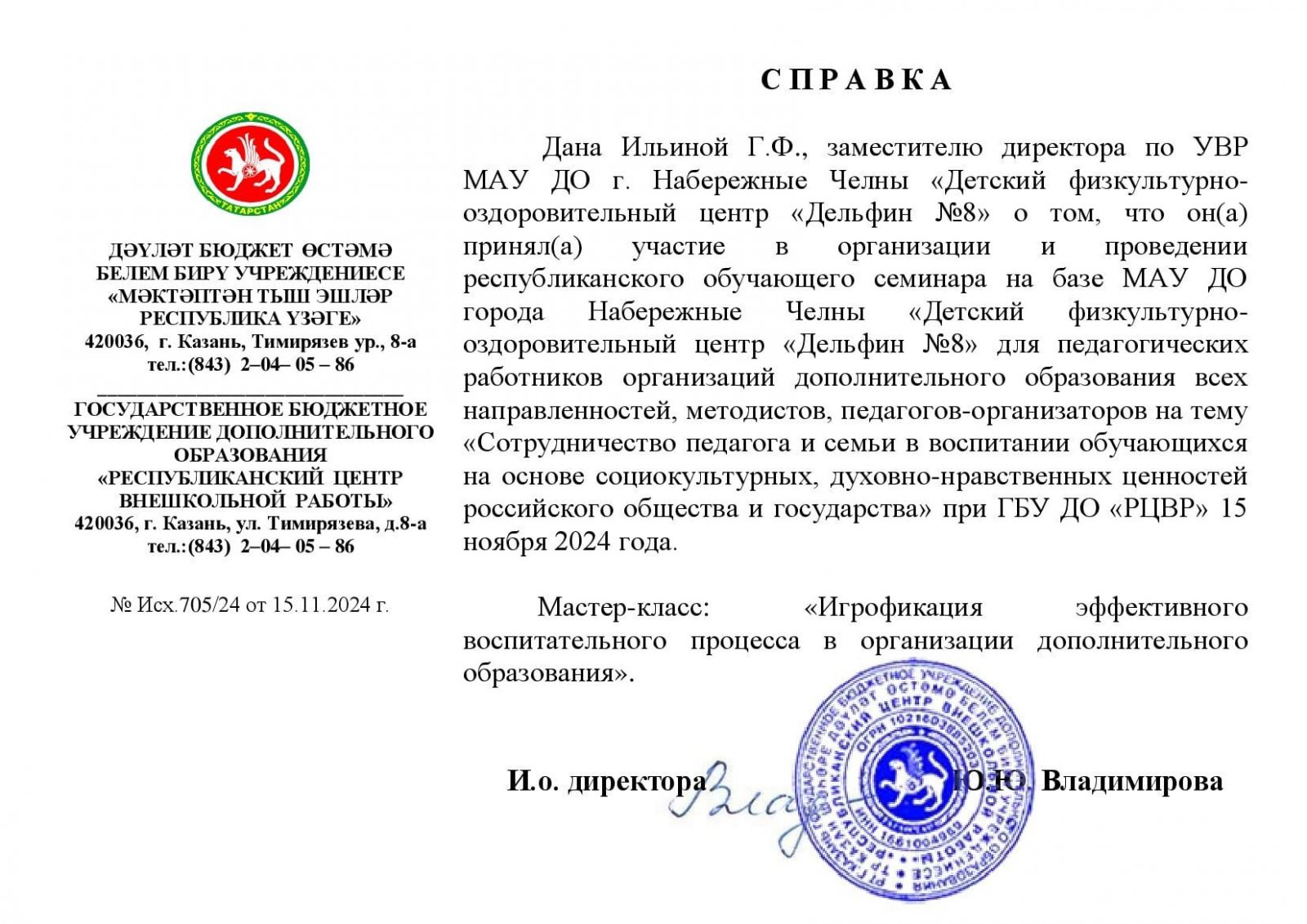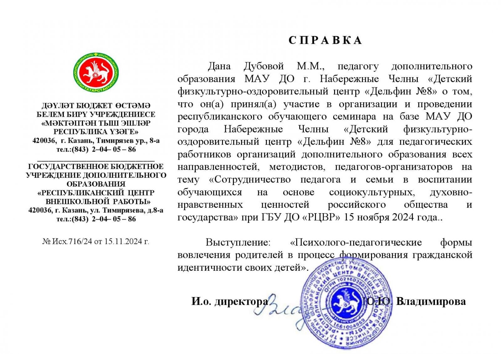- Вотинцева Т.В., Дубовая М.М., Ильина Г.Ф., Миниханова С.А., Цыганов И.В. - приняли участие в республиканском обучающем семинаре "Сотрудничество педагога и семьи в воспитании обучающихся на основе социокультурных, духовно-нравственных ценностей российского общества и государства" (15.11.2024)