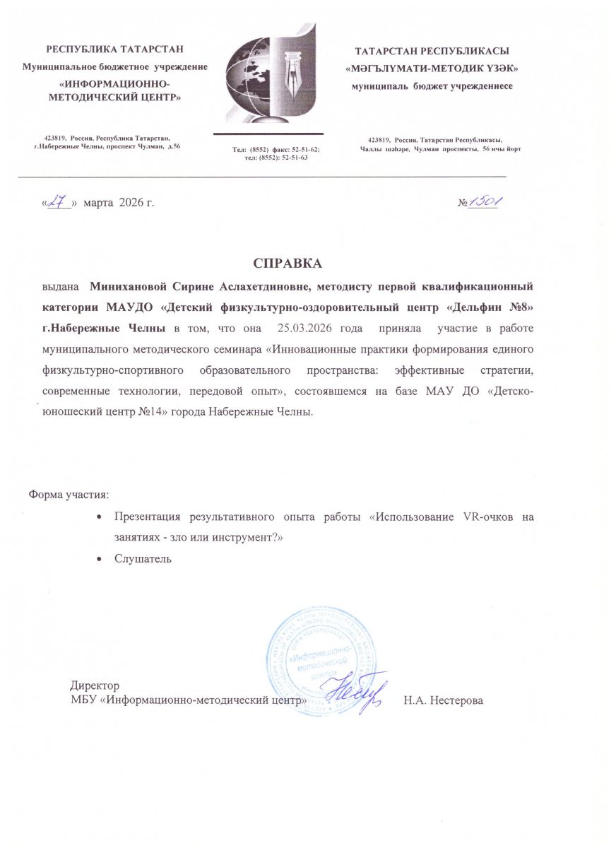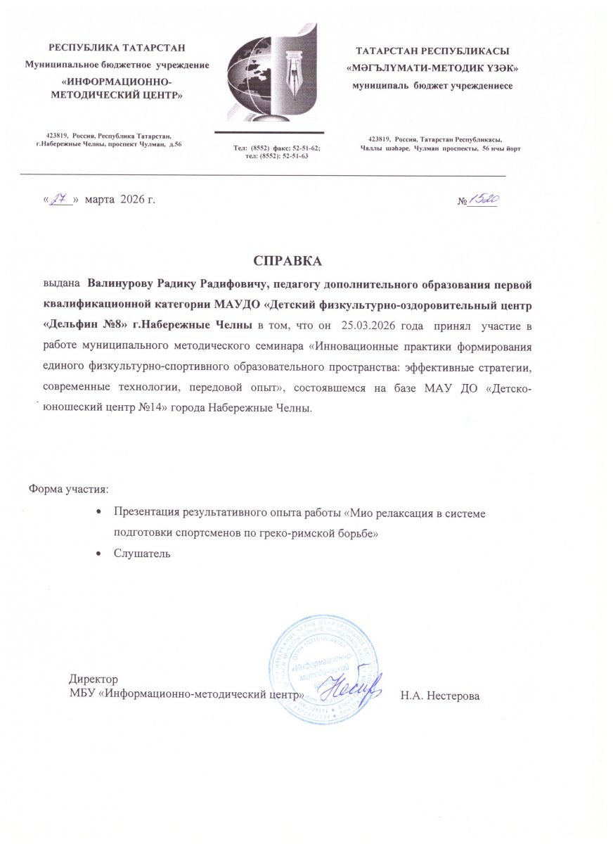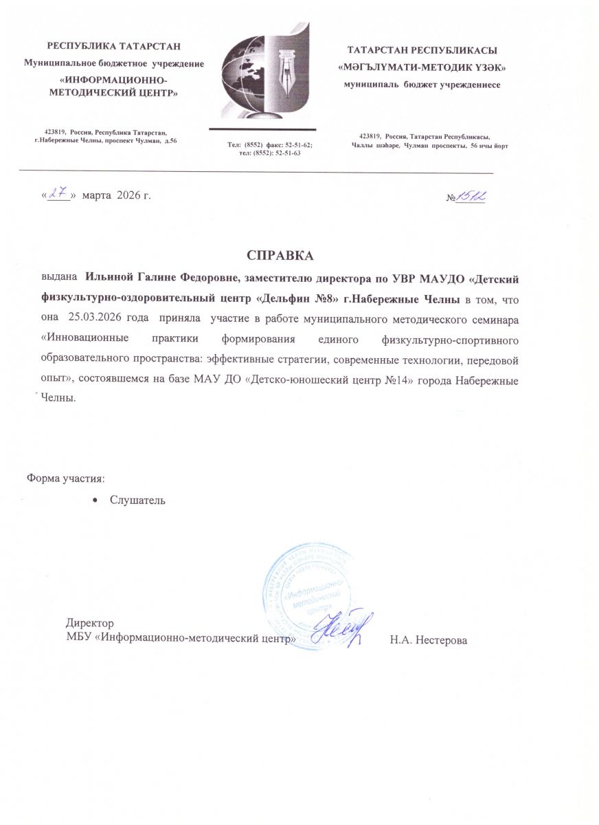 Ильина Г.Ф., Костенко Ю.В., Миниханова С.А., Акмалова А.А., Валинуров Р.Р., - приняли участие в муниципальном методическом семинаре «Инновационные практики формирования единого физкультурно-спортивного образовательного пространства: эффективные стратегии, современные технологии, передовой опыт» (25.03.2026)