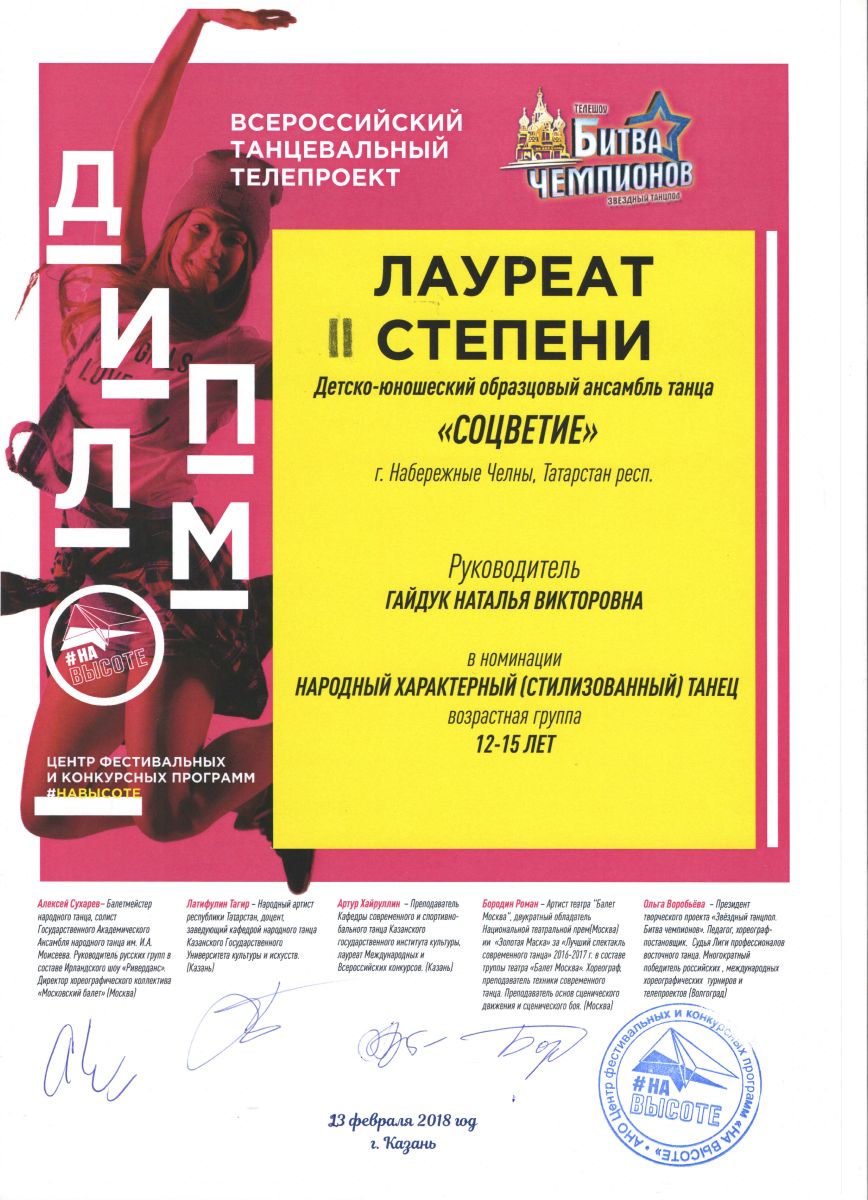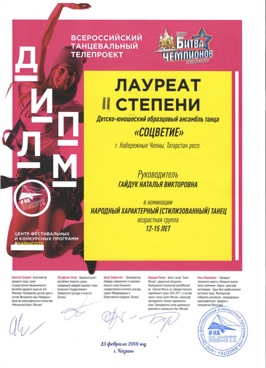 Всероссийский танцевальный телепроект Лауреат 2 степени Соцветие народный 12-15 лет.jpg