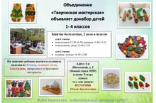 Мы рады сообщить Вам, что открыт набор учащихся на 2024/2025 учебный год в объединение «Творческая мастерская» в возрасте от 7 до 12 лет. Учащийся приобретет знания и практические навыки в таких видах изобразительной деятельности, как лепка, аппликация, рисование через знакомство с нетрадиционными техниками изображения. В программу входят занятия по знакомству детей с изобразительным искусством, а также дидактические игры и упражнения