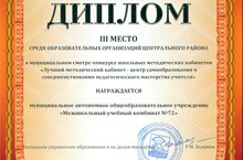 МАОУ "Межшкольный учебный комбинат №72" награжден дипломом III степени за участие в конкурсе школьных методических кабинетов