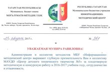 Администрация и коллектив методистов МБУ «Информационно-методический центр» выразил глубокую признательность директору и коллективу МАУ ДО «ЦДТТ № 5» за плодотворную методическую и конкурсную работу в 2016-2017 учебном году, сотрудничество и отзывчивость. Работа сотрудников ЦДТТ № 5 оценена как интенсивная, эффективная и бескорыстная.«Мы высоко ценим сотрудничество с Вами и надеемся на дальнейшее продолжение продуктивной работы. Желаем руководителю и коллективу Центра детского технического творчества № 5 слаженной работы, творческих успехов, здоровья и процветания на долгие годы! Спасибо Вам от всего сердца!» - такими словами закончено благодарственное письмо от Информационно-методического центра.