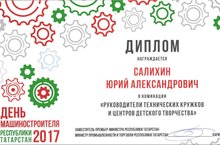 Наш педагог Салихин Юрий Александрович по результатам плодотворной работы был признан как «Лучший руководитель технического кружка дополнительного образования детей» и был приглашен на награждение ценным подарком , поздравление министра промышленности и торговли Республики Татарстан Каримовым А.А. -
