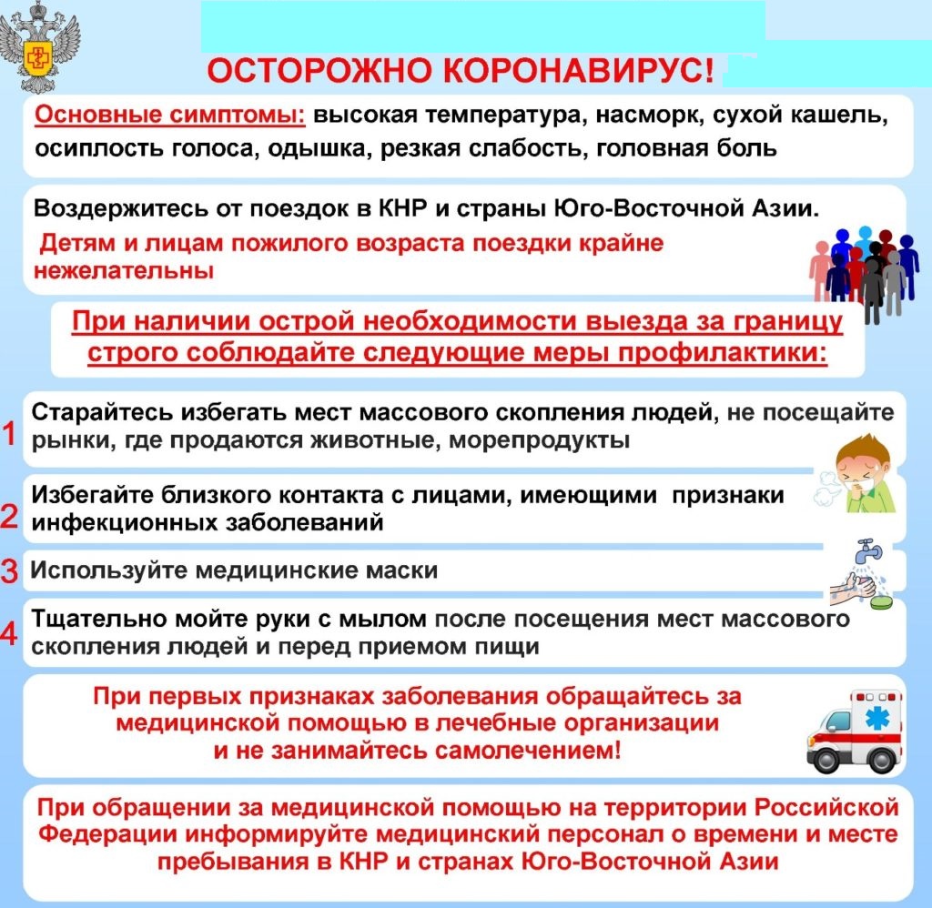 В связи с началом эпидемического подъема заболеваемости гриппом на территории РФ и осложнением эпидемической ситуации по короновирусной инфекции в КНР, в целях усиления мероприятий по информированию населения о мерах личной и общественной профилактике гриппа, ОРВИ и короновирусной инфекции (2019-nCoV) рекомендуется ознакомиться с мерами профилактики