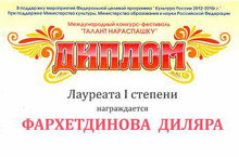 Поздравляем учащуюся Фархетдинову Диляру ставшую лауреатом I степени Международного конкурса-фестиваля «Талант нараспашку», проведенного при поддержке Министерства культуры, Министерства образования и науки Российской Федерации. 17.04.2015