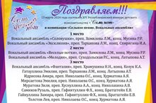 1 место - Вокальный ансамбль «Соловушки» - преп. Замилова Л.М., конц. Мусина Р.Р., вокальный ансамбль «Эксклюзив» - преп. Тарханова Л.М., конц. Спирягина И.А.