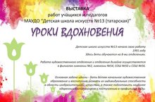 22 ноября в 16.00 в Доме дружбы народов "Родник" состоится открытие выставки творческих работ учащихся и педагогов художественного отделения и отделения дизайна ДШИ №13 "Уроки вдохновения".