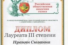 6 - 9 декабря 2016 года в городе Альметьевск, под эгидой Российской общественной академии голоса прошел IX международный вокально-чтецкий конкурс - практикум. От нашей школы в конкурсе приняли участие трое обучающихся класса Медведевой Л.М.