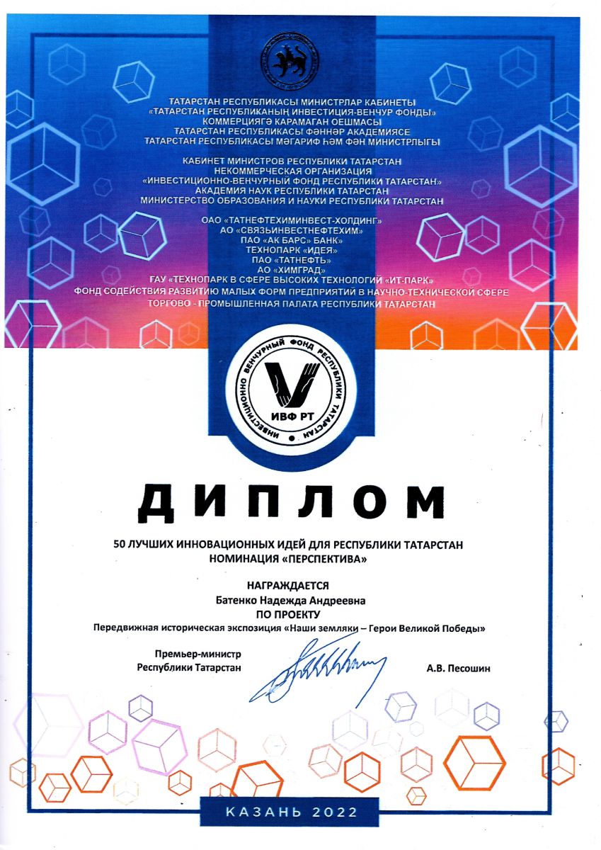 1. Победа в грантовом конкурсе "50 инноваций в образовании", номинация "Перспектива" (ученица Батенко Надежда, преподаватель Батаева Л.А.)