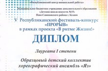В рамках проекта "В ритме Жизни" ГБУДО "Республиканский центр внешкольной работы" в ноябре 2020 года проводил Республиканский фестиваль-конкурсе "Прорыв". Хореографический коллектив "ЯЗ" , преподаватель Гареева Лилия Ильмировна и концертмейстер Калинина Светлана Михайловна, участвовал в этом конкурсе и занял призовое место. Поздравляем!
