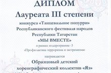 Наш творческий коллектив принимал участие в конкурсе "Танцевальное попурри" Республиканского фестиваля народов РТ "Мы вместе". Подведены итоги : на муниципальном этапе конкурса мы стали Лауреатами первой степени, на республиканском уровне - Лауреаты третьей степени. Поздравляем всех с победой!