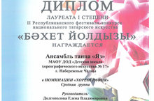 На II Республиканском фестивале-конкурсе национального татарского искусства "Бэхет йолдызы" Ансамбль "Яз заслужил диплом Лауреата I степени.