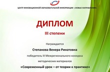 А.Н.Ротанова и В.Р.Степанова стали дипломантами III степени III Межрегионального конкурса авторских методических разработок "Современный урок - от теории к практике"