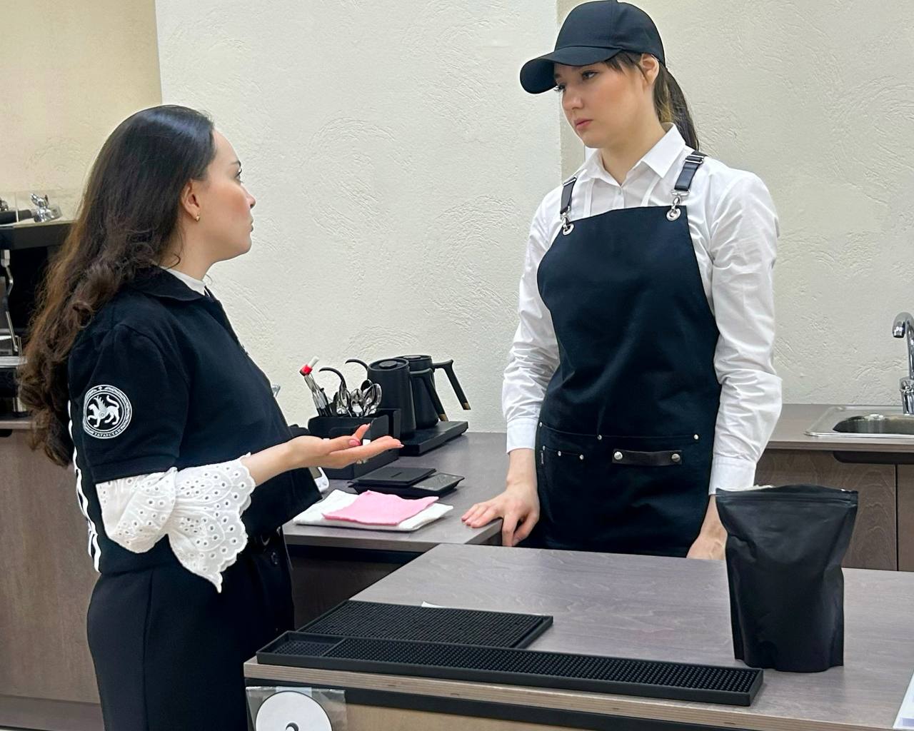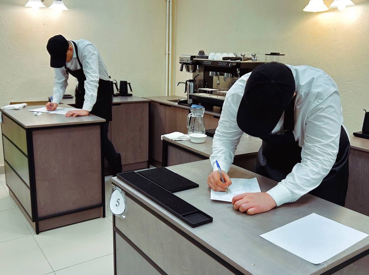 Финальным заданием заключительного дня Чемпионата является модуль «Наставничество», где конкурсанты обучают волонтеров выполнению конкурсных заданий по мастерству приготовления кофе и чая.