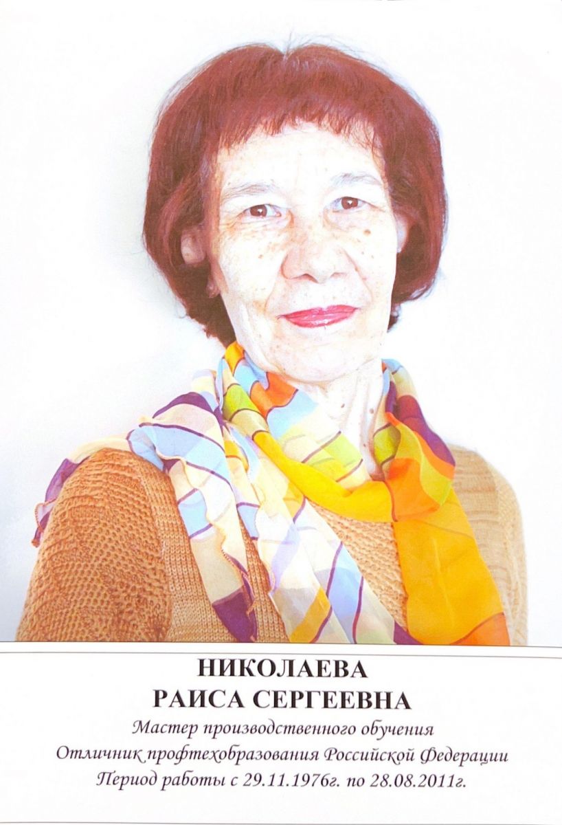 Николаева Раиса Сергеевна в 1969 году окончила Чебоксарское училище и начала свой трудовой путь продавцом в универмаге. Воспитанная в семье преподавателей: мама –Николаева Матрена Григорьевна была учителем химии, биологии, а папа работал в школе заместителем директора по АХЧ - Раиса Сергеевна проявила талант и любовь к обучению. Судьба привела ее в родное училище, где она стала мастером производственного обучения.