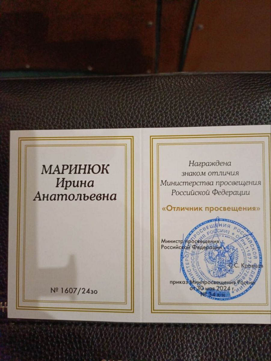 Нагрудным знаком Министерства образования и науки РФ «Отличник просвещения» награждена мастер производственного обучения Маринюк Ирина Анатольевна.
