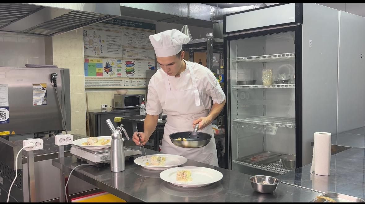 Студент 3 курса специальности 43.02.15 Поварское и кондитерское дело Разов Тимур успешно справился с заданием Сетевого этапа Регионального чемпионата.